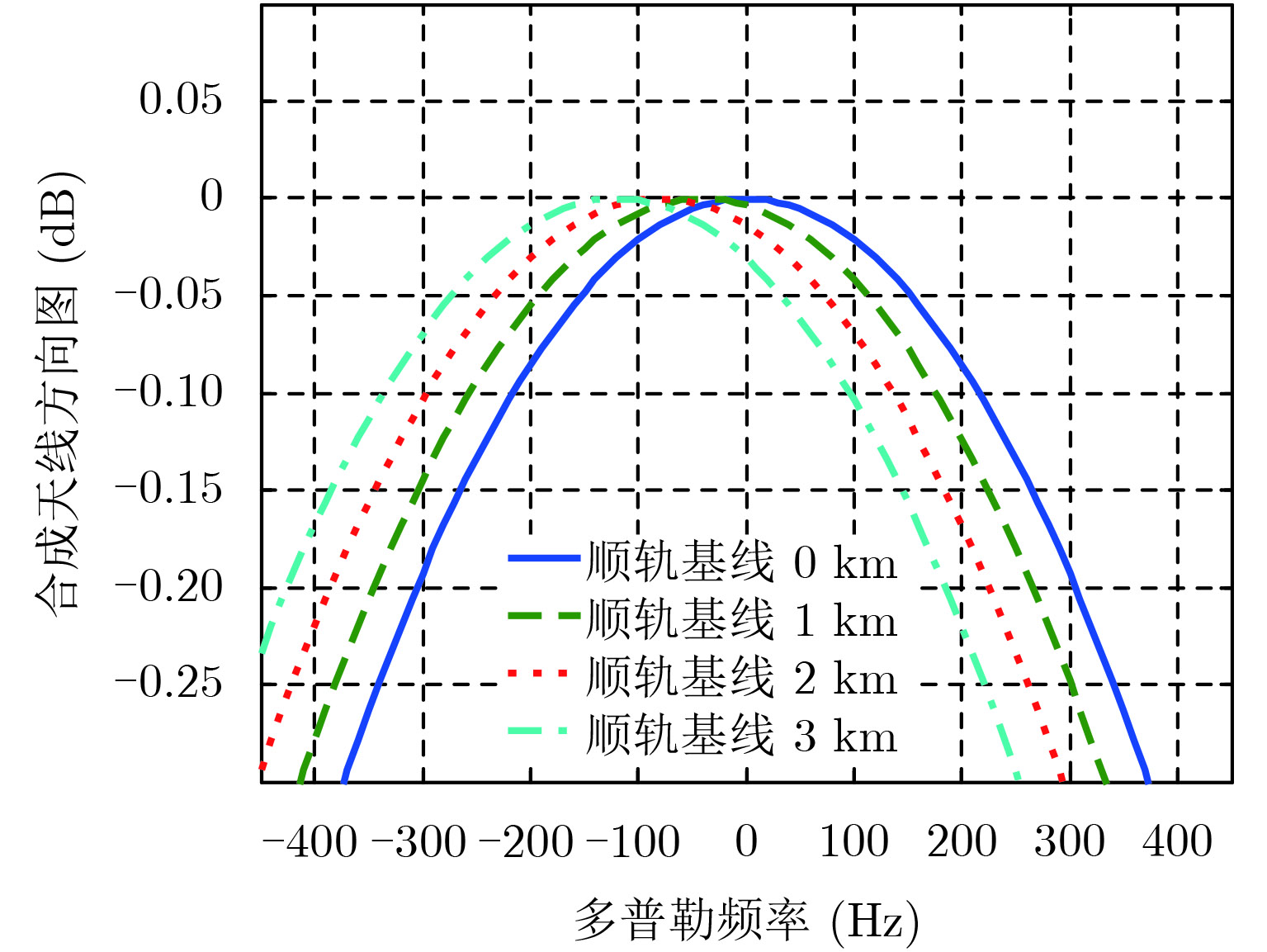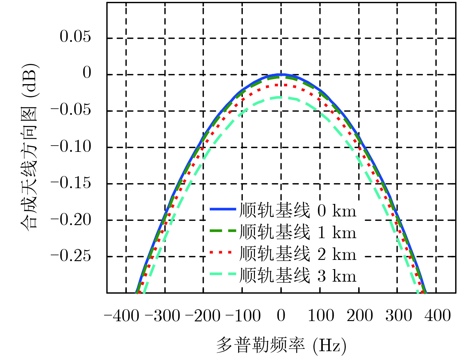 图3中,由于对主辅双星均进行零多普勒姿态导引,合成后的方位天线方向图等效于正侧视,此时对多普勒去相干影响很小。考虑到主辅双星之间顺轨基线的影响,合成后的天线方向图幅度会有一定的下降,从仿真中可以看出,在顺轨基线小于3 km的情况下,导致的幅度衰减小于0.05 dB,可以忽略。在不同顺轨基线情况下,主辅星同时进行零多普勒导引的合成天线方向图对频谱加权的计算公式为[7]:
