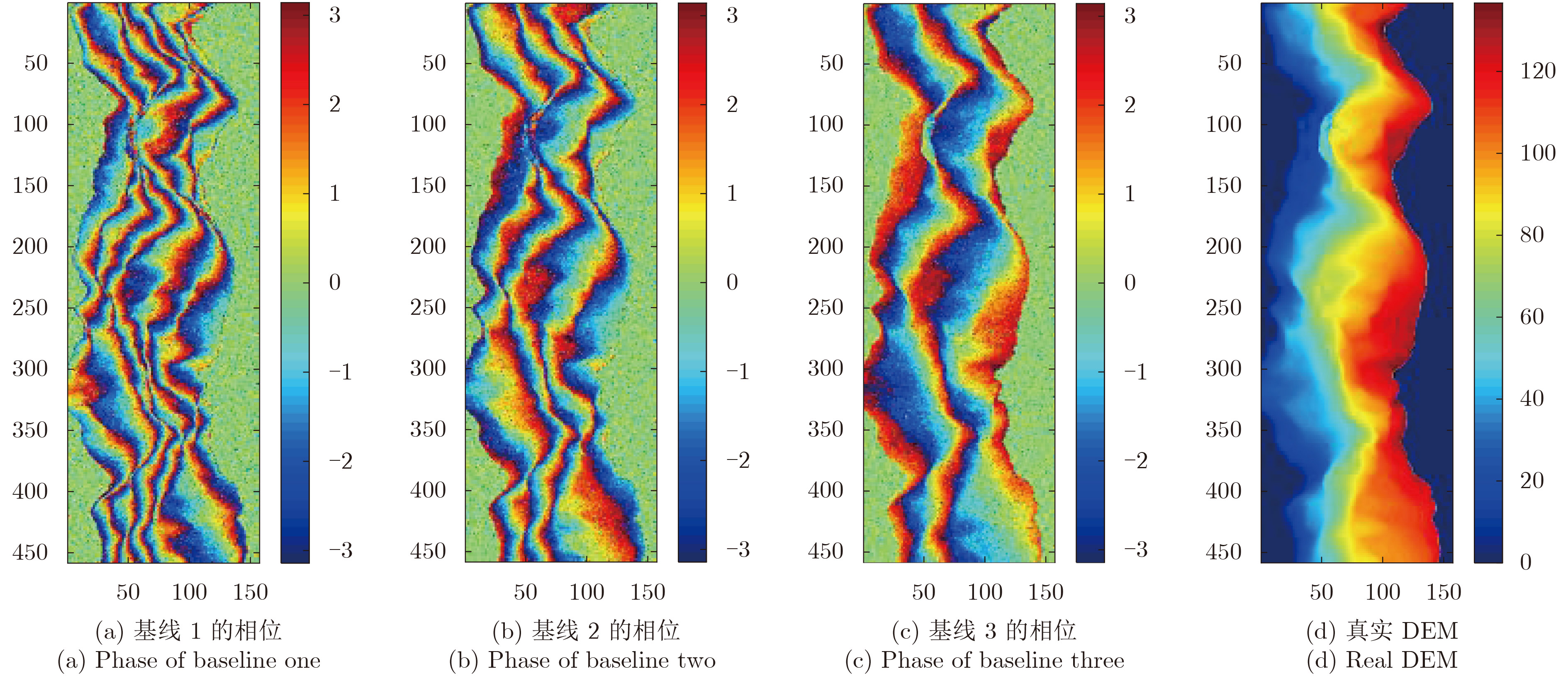4.1 仿真实验本文采用了一组接近真实地形的仿真数据进行实验,该仿真数据是根据美国Isolation Peak国家公园的真实数字高程得到的。仿真参数如表1所示,3条基线对应的高度模糊数分别为21.4 m, 32.1 m和53.5 m。图3(a),图3(b),图3(c)分别为仿真得到的3条不同基线对应的缠绕干涉相位图。图3(d)为Isolation Peak国家公园的真实DEM(458×157像素)。图3(d)右侧有一条垂直高度差达到137 m的悬崖,对应的干涉相位差分别为12.8