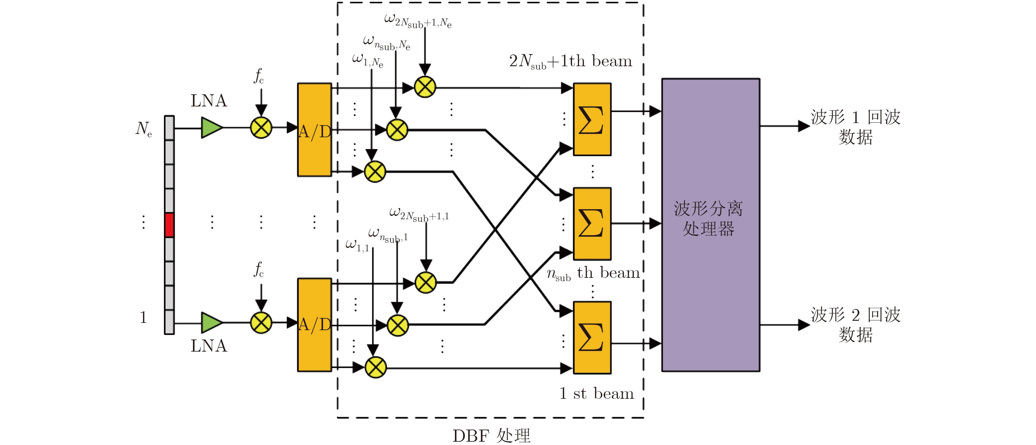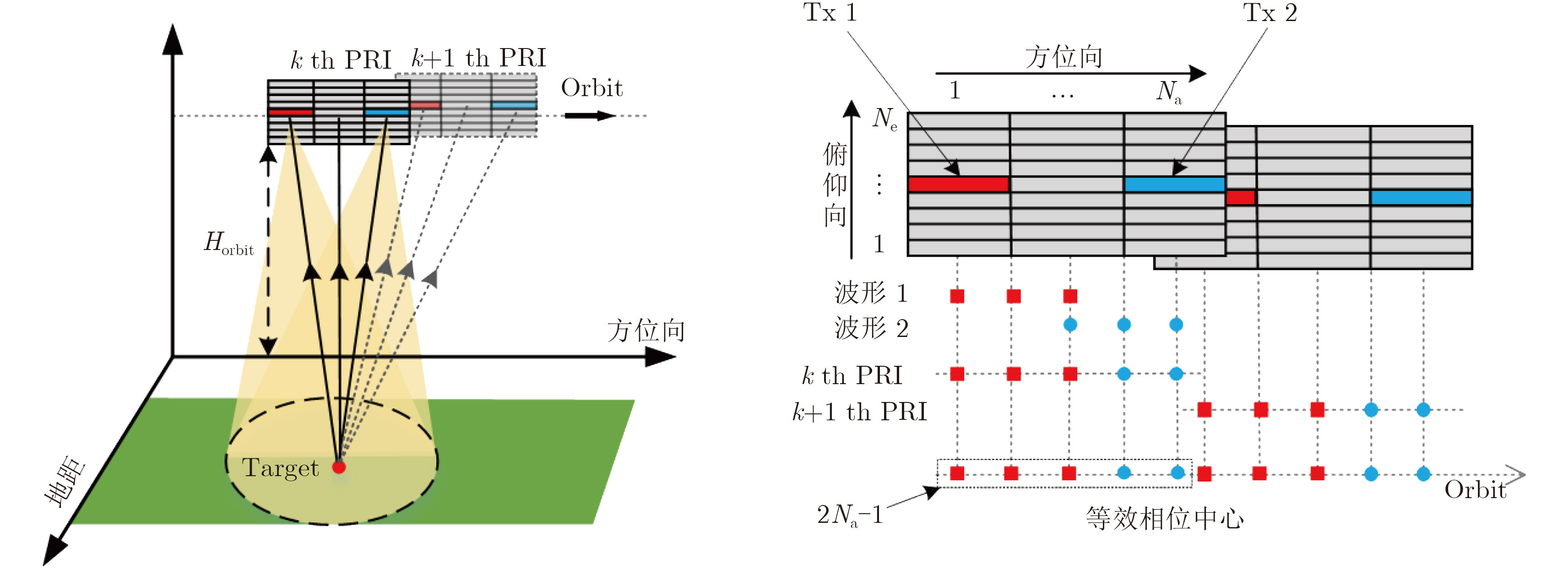 图1描述了两波形情况下的MIMO SAR成像几何模型和天线结构。接收天线在俯仰向具有Ne个子孔径,在方位向具有Na个子孔径。两个发射天线Tx 1(红色)和Tx 2(蓝色)分别发射波形1和波形2,所有接收天线接收地面场景回波,该系统在1个脉冲重复间隔(PRI)内能获得2Na–1个方位向等效相位中心。因此,MIMO SAR系统的脉冲重复频率相比传统单通道SAR系统的脉冲重复频率可降低
