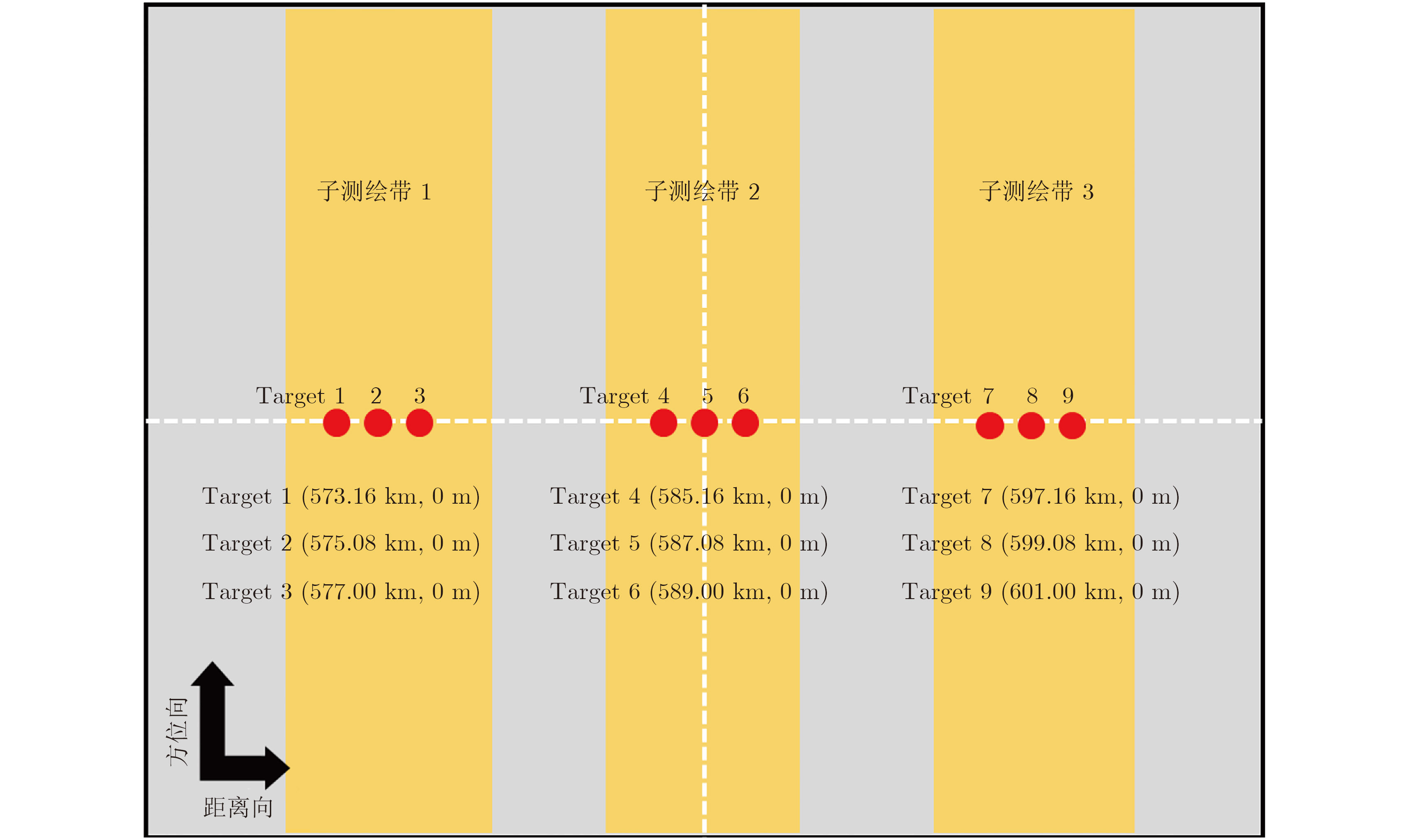 本节将给出9点目标的仿真实验,图10为这些点目标的成像场景示意图。假设这些点目标的回波幅度都被归一化处理,在回波信号仿真中只考虑存在高斯白噪声。由图4和图10可见,成像场景中存在3个子测绘带,每个子测绘带包含3个点目标。根据这些点目标的斜距可计算得到,目标1, 4和7之间的双程时延差为