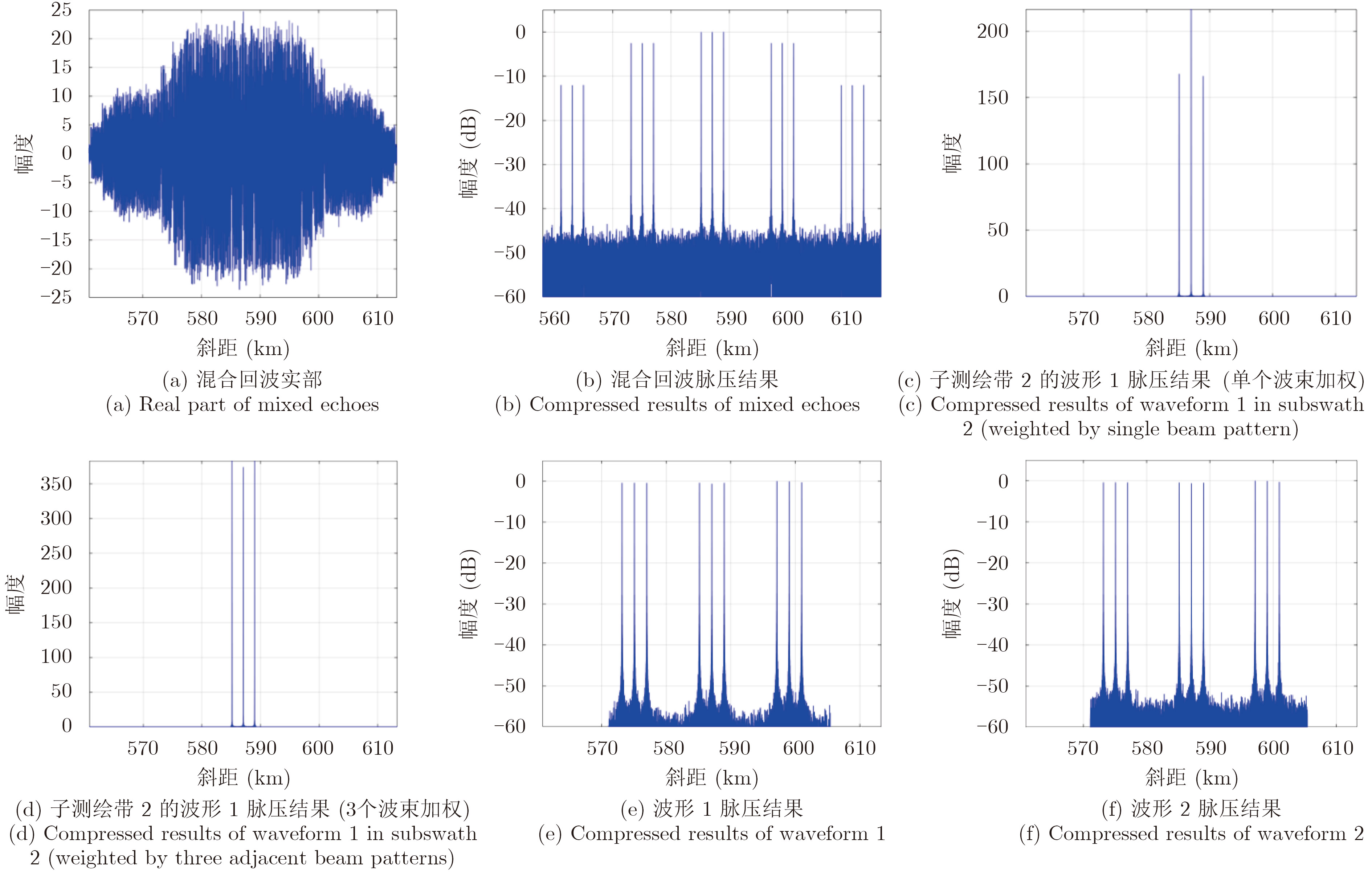 本节将通过一个X波段星载MIMO SAR系统来验证本文提出的处理方案。表1为系统参数,图8为系统所选波位。根据图1所示的天线结构示意图可知,接收天线在方位向由3个子孔径组成,因此该系统在一个脉冲重复间隔内可获取5个等效相位中心。为了确保回波信号在方位向过采样,系统脉冲重复频率需要满足不等式