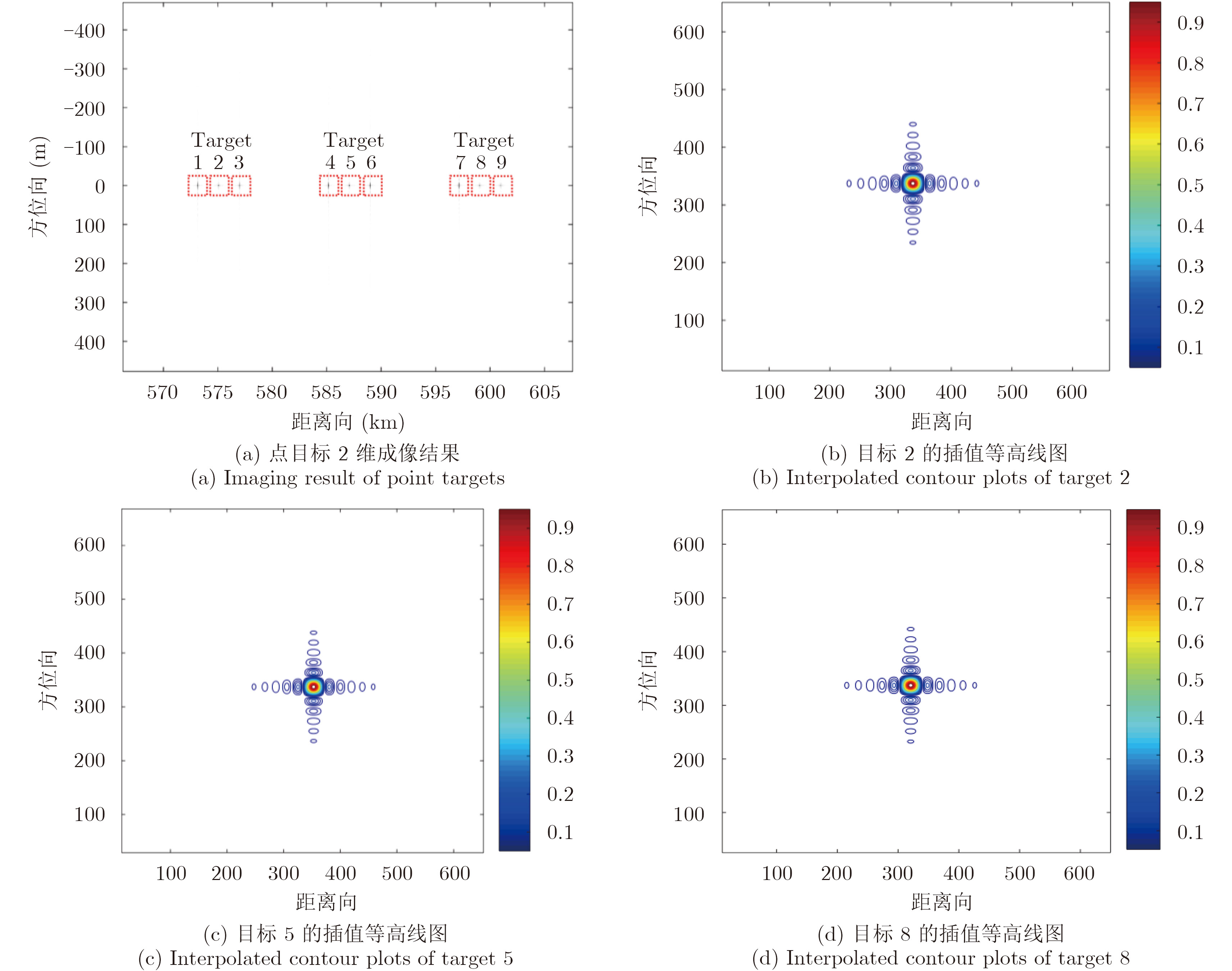 。根据第2节分析可知,STSO波形的相互干扰将存在于原始回波数据中。图11(a)为回波信号的实部,图11(b)为回波信号经过匹配滤波处理得到的距离向脉压结果。从图中可见9点目标回波的脉压结果相互重叠,并出现明显的虚假目标。使用多波束DBF提取中间子测绘带的回波,并对STSO波形进行分离处理,得到点目标4, 5, 6的两个波形距离向脉压结果。如图11(c)所示,点目标4, 5, 6的波形1脉压结果幅度存在明显起伏。经过相邻波束方向图的加权和叠加处理,这3个点目标的波形1脉压结果幅度起伏得到减轻,如图11(d)所示。图11(e)和图11(f)分别为波形1和波形2的9点目标距离向压缩结果,可以看出STSO波形的相互干扰被有效抑制,9点目标能被清楚辨别。对9点目标进行方位向多通道数据重构,用传统成像算法对重构数据进行成像处理,得到2维成像结果,如图12(a)所示。图12(b)、图12(c)和图12(d)分别是点目标2, 5和8的插值等高线图,表2为这3个点目标的图像质量参数,可以看出STSO波形的干扰能量被有效抑制,点目标聚焦良好,证明所提出的处理方案具有较好的成像性能。