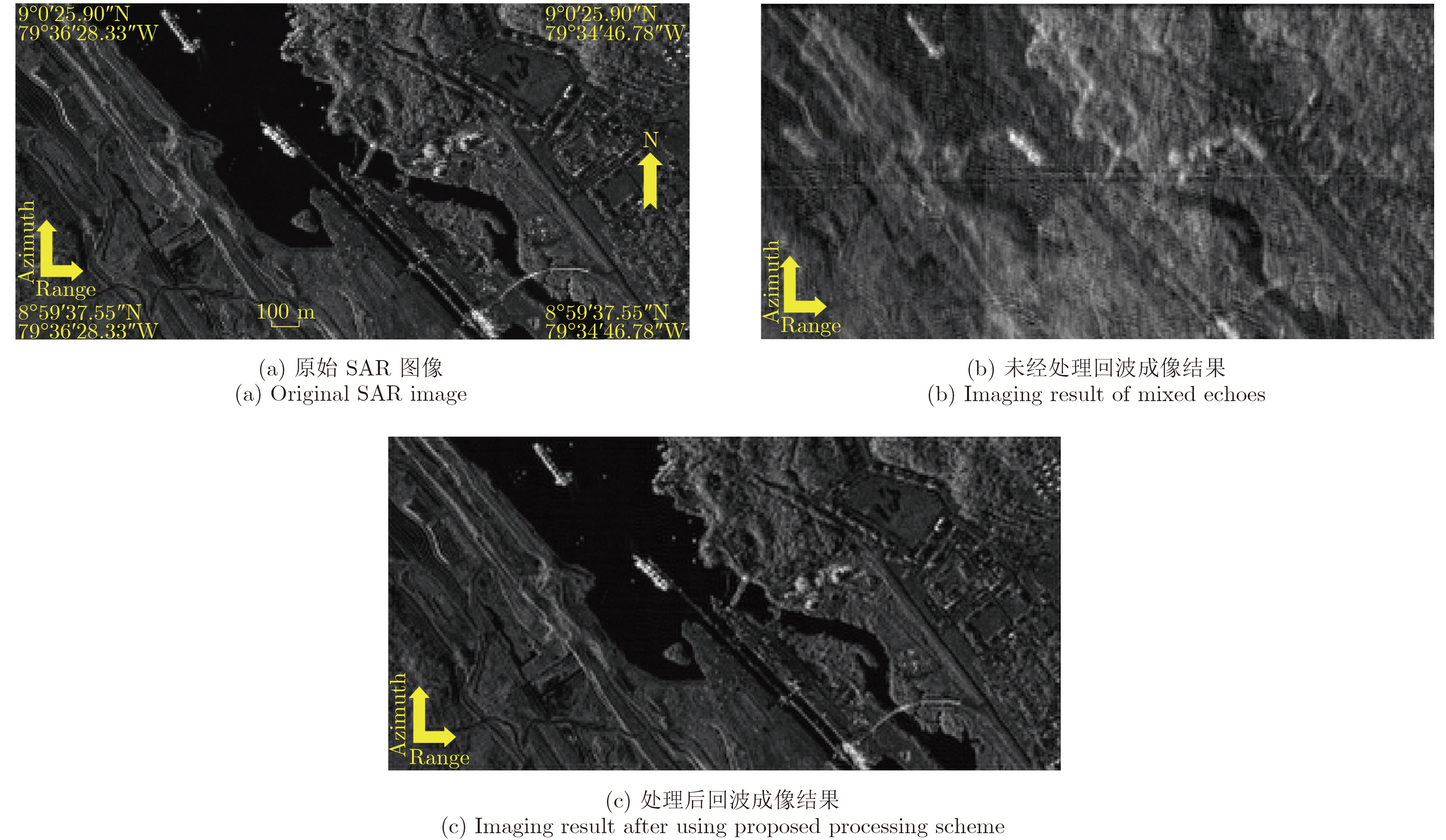 为了进一步验证所提出的处理方案,本节给出了分布目标的仿真试验结果。图13(a)为原始的SAR幅度图像。图13(b)为未经过处理的混合回波成像结果,可以看出STSO波形之间的干扰能量严重影响SAR图像的解译。使用本文提出的处理方案对分布目标混合回波进行处理后,得到的成像结果如图13(c)所示。对比图13(b)和图13(c)可见,针对基于STSO波形的MIMO SAR系统,该处理方案能够有效抑制波形之间的相互干扰,并且具有良好的成像性能。
