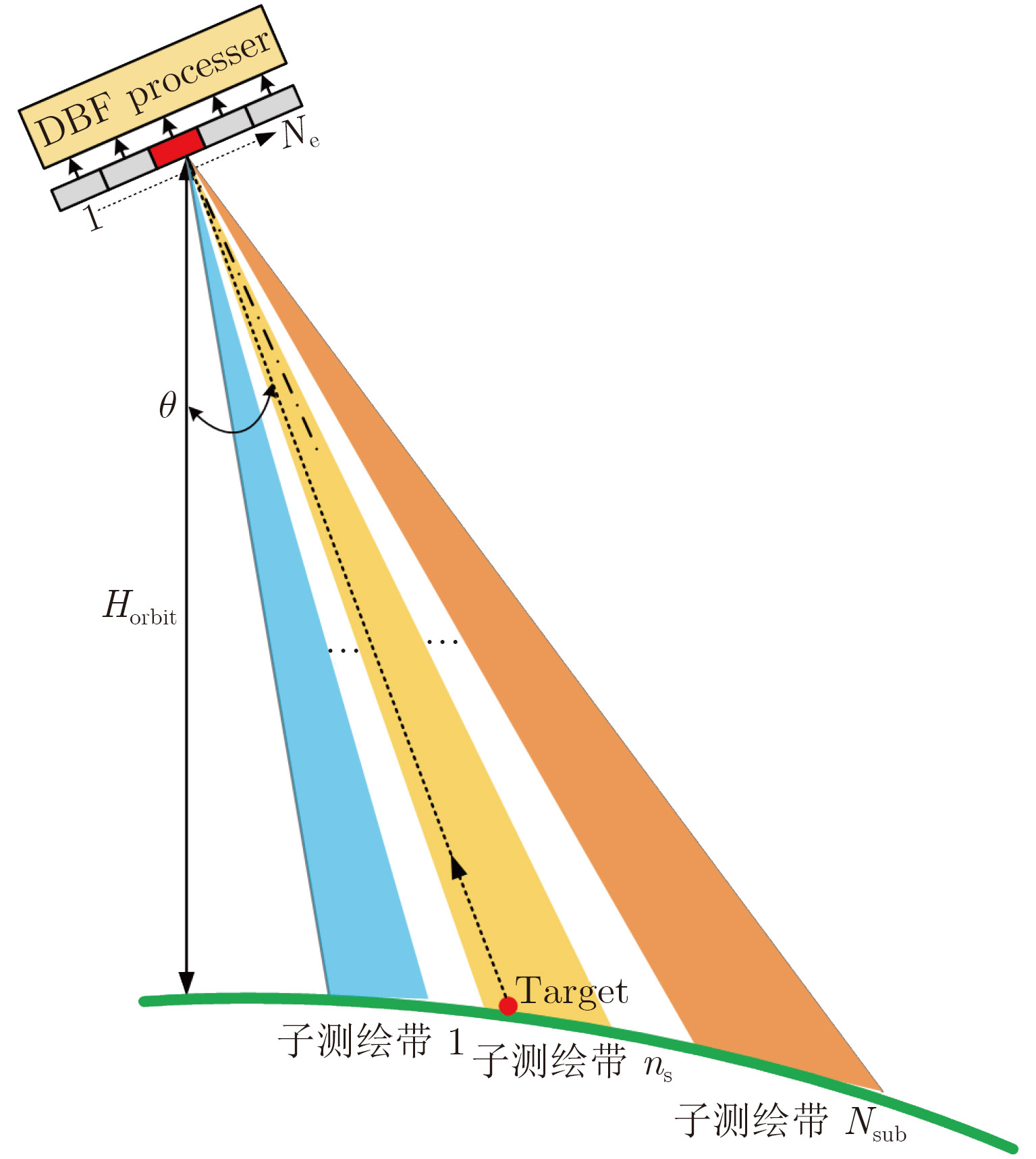 合成孔径雷达(Synthetic Aperture Radar, SAR)是一种主动式微波遥感系统,具有全天时、全天候的对地观测能力,在测绘、地面目标识别、自然灾害监测、军事侦察等领域具有重要的应用价值[1]。但是由于传统单通道合成孔径雷达不能同时获取方位向高分辨率和距离向宽测绘带的SAR图像[2],其有限的成像能力越来越不能满足人们对SAR图像质量的要求。随着多通道技术的发展和数字波束形成技术(Digital BeamForming, DBF)的应用,配备多个接收天线的SAR系统能够同时改善SAR图像的空间分辨率和测绘带宽度[3–5]。为了进一步提升成像性能,多发多收(Multiple-Input Multiple-Output, MIMO)体制的SAR系统成为未来新体制SAR发展方向上的研究热点[6–9]。MIMO SAR发射多个正交波形照射地面场景,利用所有天线接收回波并分离发射波形,能够获得最大化的空间自由度,从而具有潜力实现很多先进的成像模式[10,11],例如全极化高分宽幅成像模式、多模式混合成像等,因此MIMO SAR是未来遥感应用中能够满足用户矛盾需求的理想解决方案。