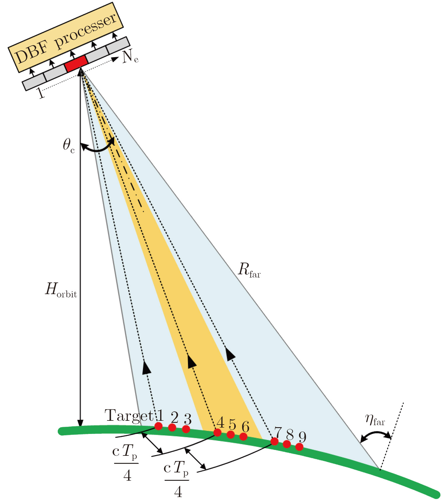 根据上节的分析可知,对于STSO波形,成像场景中任意点目标的干扰来源于与其相隔半个脉宽时间的回波信号,因此由DBF形成的接收窄波束的旁瓣将影响所提取的子测绘带的回波信号。如图4所示,由于旁瓣的存在,目标4的回波信号将受到目标1和7的回波信号的干扰。为了确保可靠的信号分离,接收天线宽度Hr需要满足以下限制条件: