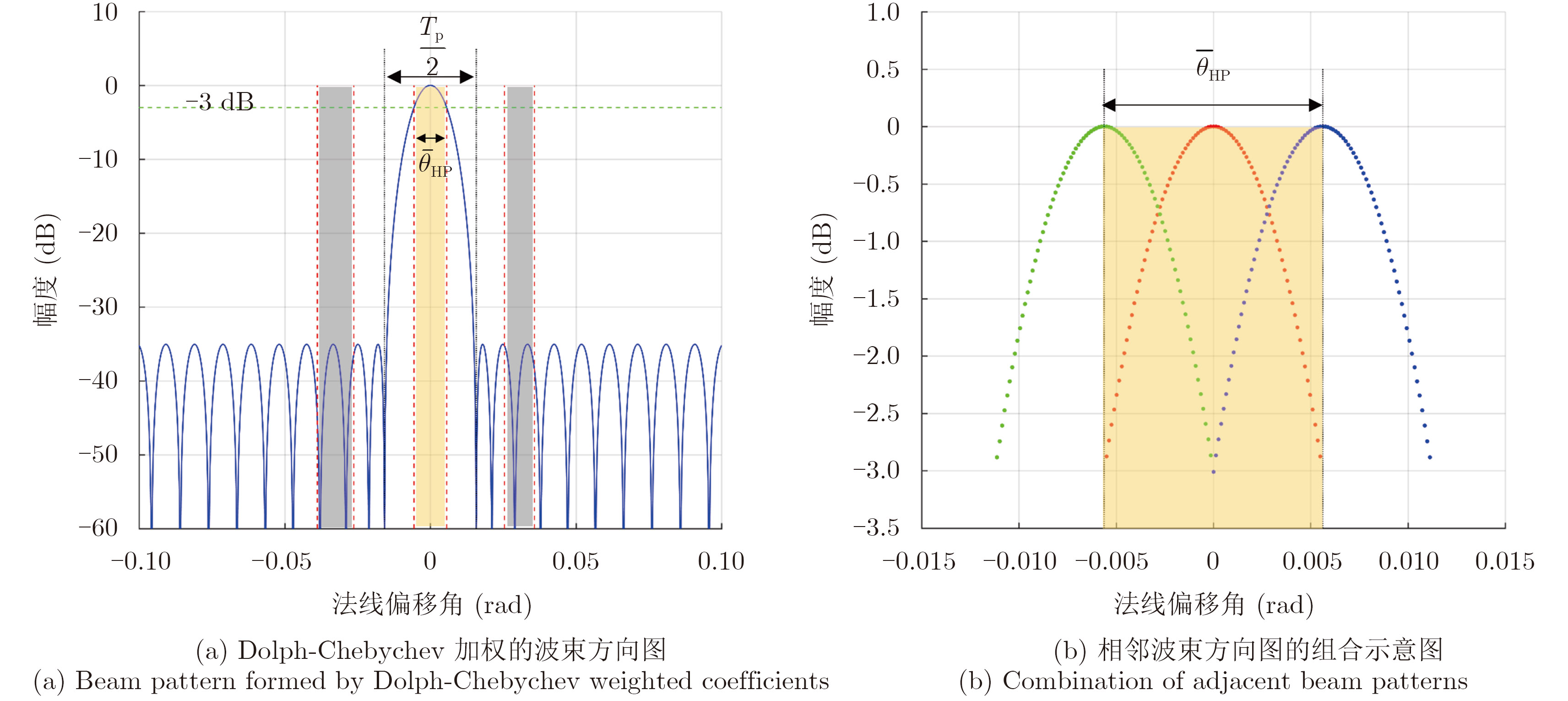 如图5(a)所示,由Dolph-Chebychev加权系数(仿真参数参考表1)计算得到的波束方向图的主瓣对应于半个脉宽的角度范围。考虑主瓣半功率波束宽度范围外的幅度分布下降很快,为了确保可靠的模糊抑制,只提取3 dB角度范围