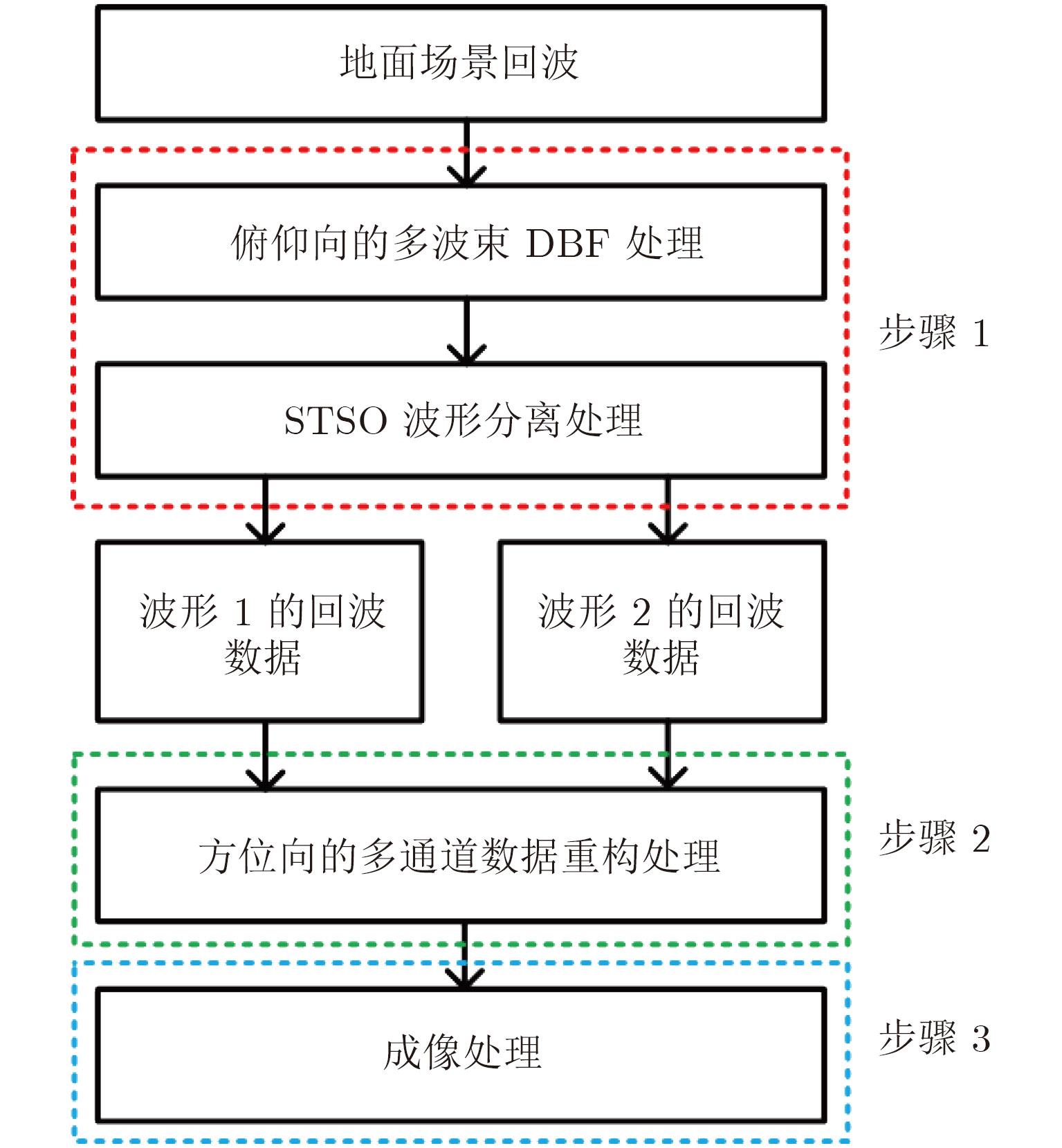 当前MIMO SAR系统所面临的主要挑战包括以下两个方面,合适的正交发射波形的设计以及相应的回波信号分离方法。根据Krieger在文献[12]中的分析,对分布目标场景成像时,不完全正交的发射波形之间的互相关积分能量将会分散开,导致SAR图像出现模糊效应。而对于完全正交波形,因为所占据的频谱相互分离,波形之间相干性很差,不利于实现MIMO SAR的应用价值。因此,设计占据相同频谱范围并能够有效分离的发射波形是实现MIMO SAR系统的基本要求。近年来,国内外学者提出和发展了许多有潜力的研究成果。由Kim提出的正交频分复用(Orthogonal Frequency Division Multiplexing, OFDM)波形[13,14]利用相互正交的子载频,能够确保波形之间的零互相关,但是如何减轻多普勒偏移的影响是一个需要仔细研究的课题。Alamouti波形[7,15,16]利用发射信号组合成的编码矩阵能够有效分离回波并获得高信噪比数据,但是如何保持稳定的通道响应是研究难点。除此之外,Krieger提出了一类新的短偏移正交(Short-Term Shift-Orthogonal, STSO)波形[12],不仅能够满足MIMO SAR波形设计的要求,而且避免了OFDM波形和Alamouti波形的缺陷。尽管利用数字波束形成技术分离STSO波形的概念已经提出,但是在MIMO SAR系统中实现这类波形的具体处理方案并未得到研究。