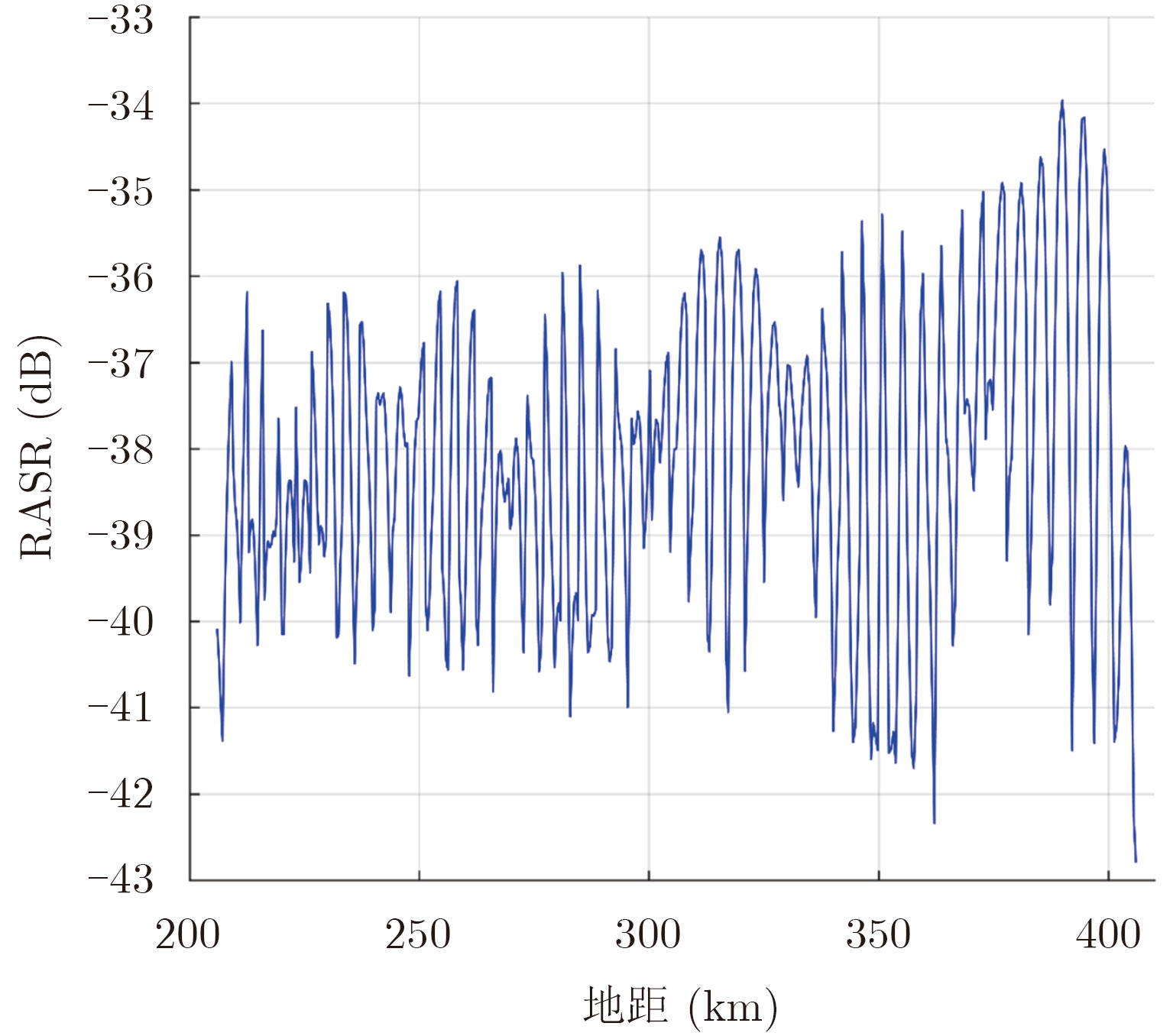 。根据表1计算可得,方位向等效采样频率为4450 Hz,大于多普勒带宽3806 Hz,满足上述不等式。为了确保可靠的波形分离,接收天线宽度被设计为3.2 m,大于式(7)给出天线宽度下限3.05 m;而天线俯仰向子孔径的宽度被设计为0.0821 m,小于式(8)给出的俯仰向子孔径宽度上限0.11 m。如图9所示,根据天线参数计算得到的整个成像场景的距离模糊信号比(Range-Ambiguity-to-Signal Ratio, RASR)小于–33 dB,这确保了STSO波形之间的相互干扰能够得到充分抑制,保证MIMO SAR的图像质量。