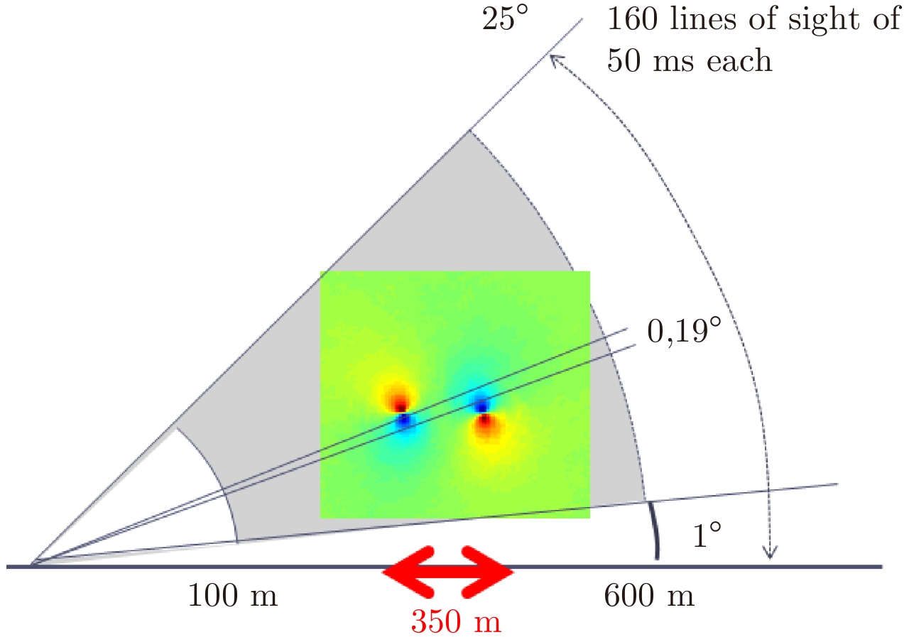 Besides, basic measurement constraints are linked to the typical characteristic scales of the phenomena of interest. For localizing wake vortices with an error smaller than 10 m the cores of the wake vortices, the spatial resolution of the LIDAR should be 5 m at least. For retrieving accurately their circulation, at least one point in each core is required. This leads to a constraint on vertical resolution of 2 m and allows to get about 10 points of wind measurements along one WV diameter (20 m typical). This allows to “resolve” the wake vortex velocity profile. Given their typical duration, a sufficient update rate must also be used (0.1 Hz at the minimum or 10 s) in order to monitor the circulation decay. Given all these constraints, the scanning scenario of a scanning coherent Doppler LIDAR for providing wake vortex data can be determined.