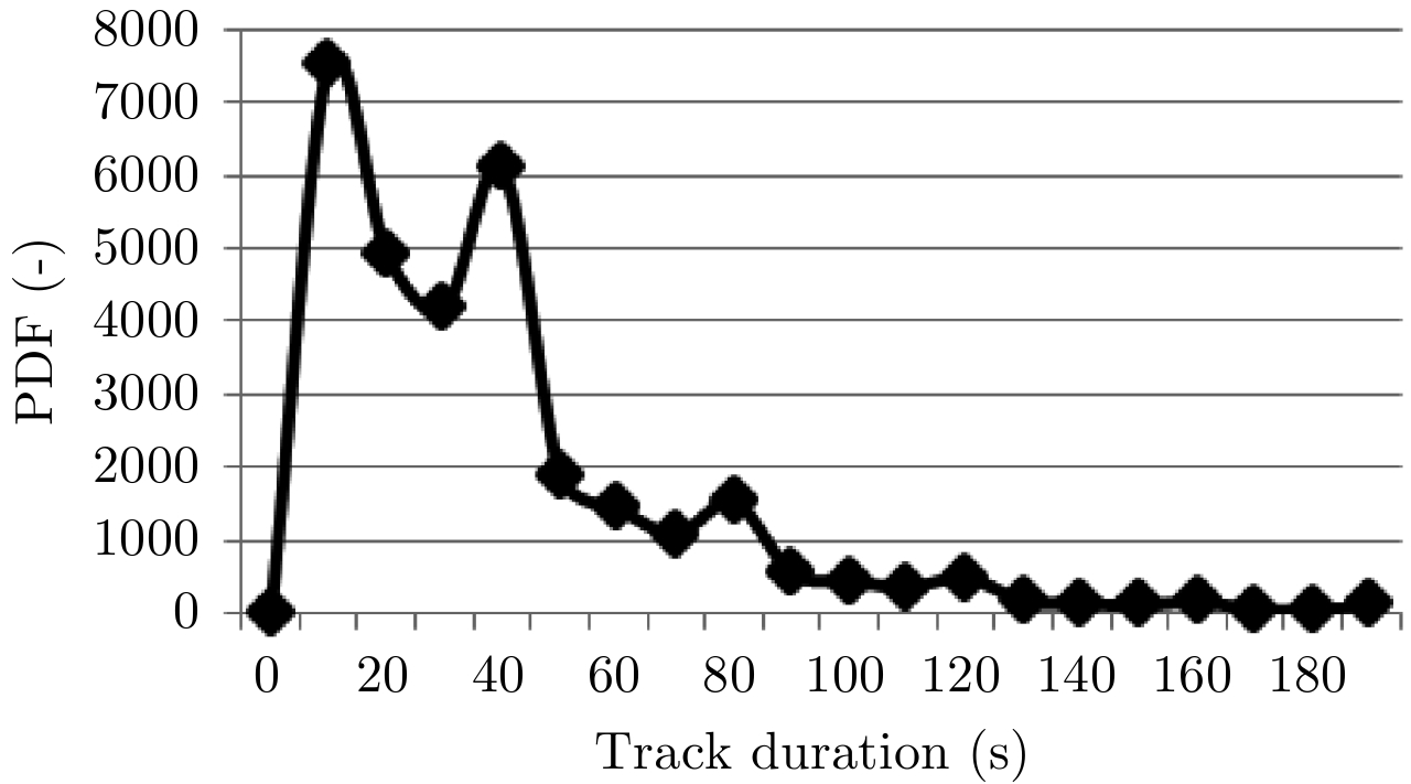 Overall, 7511 wake vortex tracks have been collected by the WINDCUBE200S LIDAR since its installation. Among them, 932 tracks starts with an aircraft hit meaning that for the first scan of these tracks the corresponding aircraft was “hitted” by the laser beam. The others (6579) correspond to a first detection. The majority of these tracks (65%) has been obtained for medium aircrafts which is coherent with the aircraft fleets of the airport. 353 tracks correspond to Jumbo aircrafts and 2372 to heavy aircrafts. The database is composed of 31228 scans which corresponds to an averaged track duration of 4 scans, roughly 30s but there are many tracks that last one to two scans especially in case of strong crosswinds. Nevertheless, 756 tracks last more than 2 min (15 scans) which represents 10% of the total tracks and still 39 tracks(representing 0.5%) above 3 min. The details of the track duration are shown in Fig. 5.