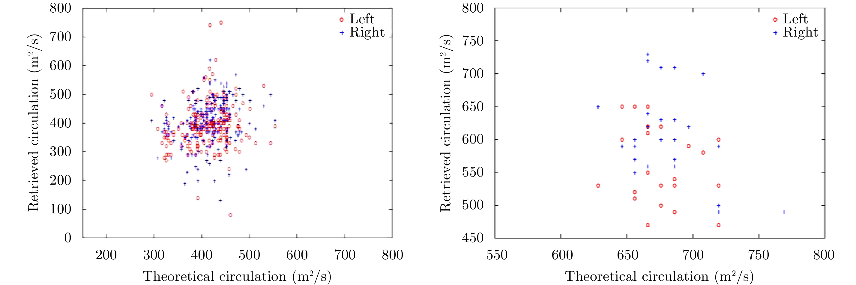 The accuracy of initial vortex spans and initial circulation obtained for Heavy and Jumbo categories are gathered in the Tab. 1 below. The preliminary results are very good according to the fact that the algorithm was launched automatically to the entire dataset and according to the uncertainties on the reference values especially for the initial circulation. Mean errors lower than the spatial resolution of 5 m are obtained. This can be explained by the fact that the localization of the wake vortex cores is performed by image processing which allows to localize wake votices between two range gates. The correlation graphs for the circulation are shown on Fig. 6 for both Heavy and Jumbo aircrafts.