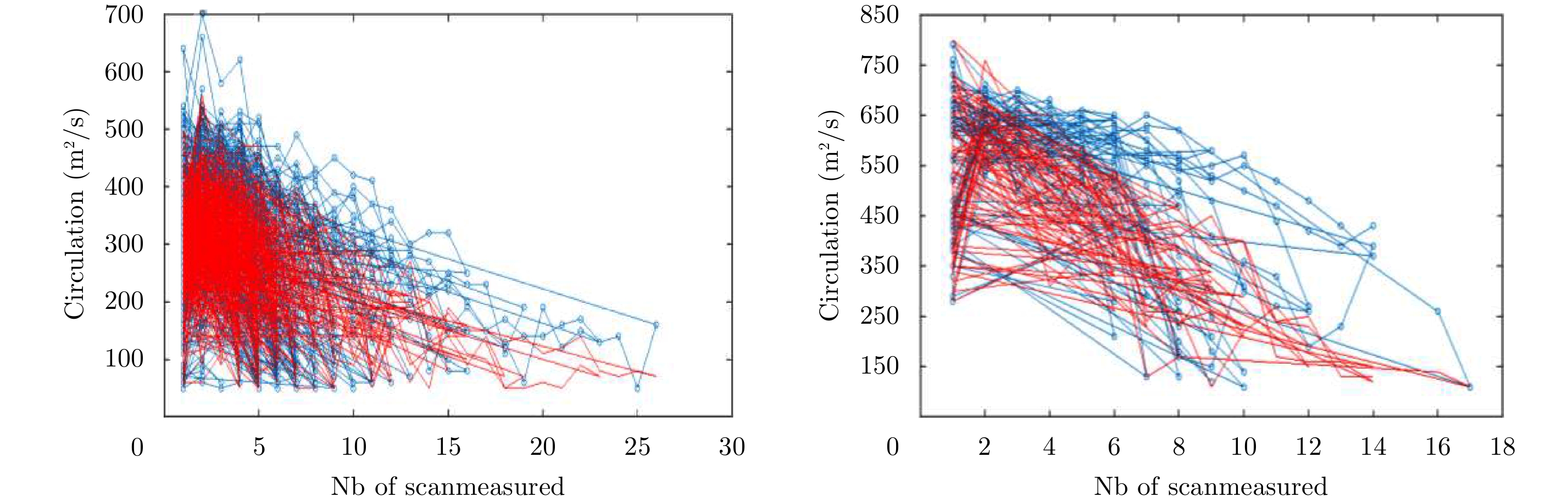 Considering all type of aircrafts and all weather conditions, 70.06% of the aircrafts landed on runway 27R have been tracked by the vortex algorithm of the LIDAR. The hit rate corresponding to only the detection of wake vortices is much higher (above 90%). The number can be explained by the difficulty in some adverse weather conditions and for the smallest aircrafts (smallest medium for Paris-Charles de Gaulle airport) to localize and compute the circulation even for the first scan. Nevertheless, this global performance has to be considered as a good performance given the fact that the algorithm has been applied in an automatic way to the entire dataset without any adjustements after the calibration period of one month.