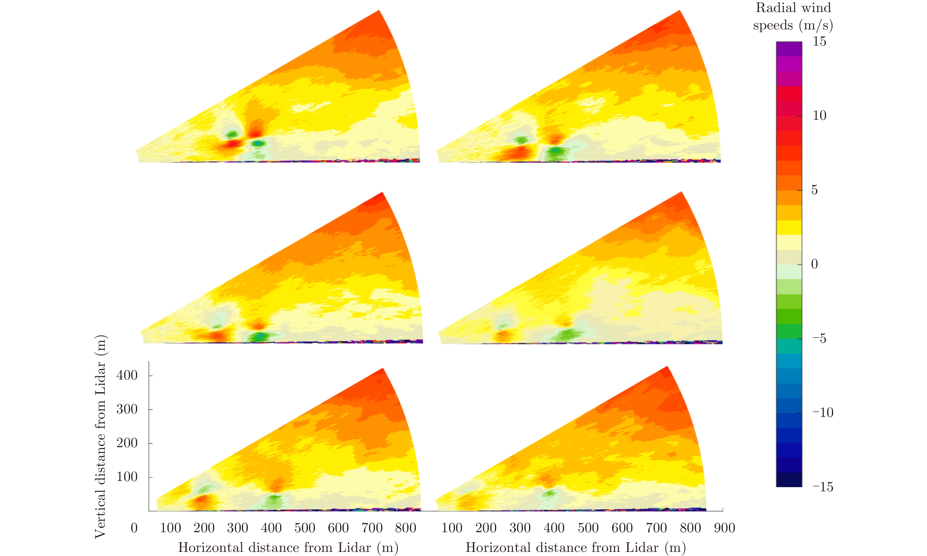 Fig.9 Maps of radial wind measurements provided by the LIDAR showing the evolution of the pair of wake vortices generated by a Jumbo aircraft the 20th of November at 18:40:58, 18:41:17, 18:41:35, 18:41:54, 18:42:13 and 18:43. |