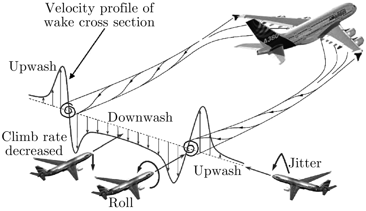 首先,飞机尾流是航空安全领域特别关注的问题。由于飞机尾流是一种强烈的非规则气流,其对后续飞机的飞行安全具有严重影响,可能发生翻滚、抖动、失速等,如图2所示。据美国国家交通安全委员会的统计,1993年到2000年间美国境内约三分之一的航空事故与尾流相关[2];另外,美国航空公司一架Airbus A300客机于2001年11月在纽约肯尼迪机场起飞后不久坠毁,导致265人死亡,即是因为前机尾流影响所致,这也是美国迄今第二大航空事故。为了减小此类事故发生的概率,国际民航组织(International Civil Aviation Organization, ICAO)根据机型、起飞重点和尺寸制定了两架飞机起飞和降落的最小安全距离。该规则虽然可以在很大程度上保证每架飞机的安全,但往往过于保守,限制了机场跑道的起飞密度。为在保证飞机飞行安全的前提下有效提升机场的起降容量和降低飞机晚点率,亟需发展飞机尾流的探测和危害评估方法,以对飞机的起降进行实时调整;这亦是欧洲统一天空空管计划[3](Single European Sky ATM Research, SESAR)和美国下一代航空运输系统[4](Next Generation Air Transportation System, NGATS)等重大科技计划的重要组成部分,中国民航近年来也提出了类似的空中交通管理系统计划[5]。当前,飞机尾流的研究引起了法国Thales公司,法国国家航天航空研究中心(French National Aerospace Research Center, ONERA),德国宇航中心(German Aerospace Center, DLR),美国国家航空航天局(U. S. National Aeronautics and Space Administration, NASA)、交通运输部(U. S. Department of Transportation, US-DOT)等机构强烈的研究兴趣,一年一度的WakeNet会议即是以航空安全中飞机尾流的影响和探测为主题的专题会议。