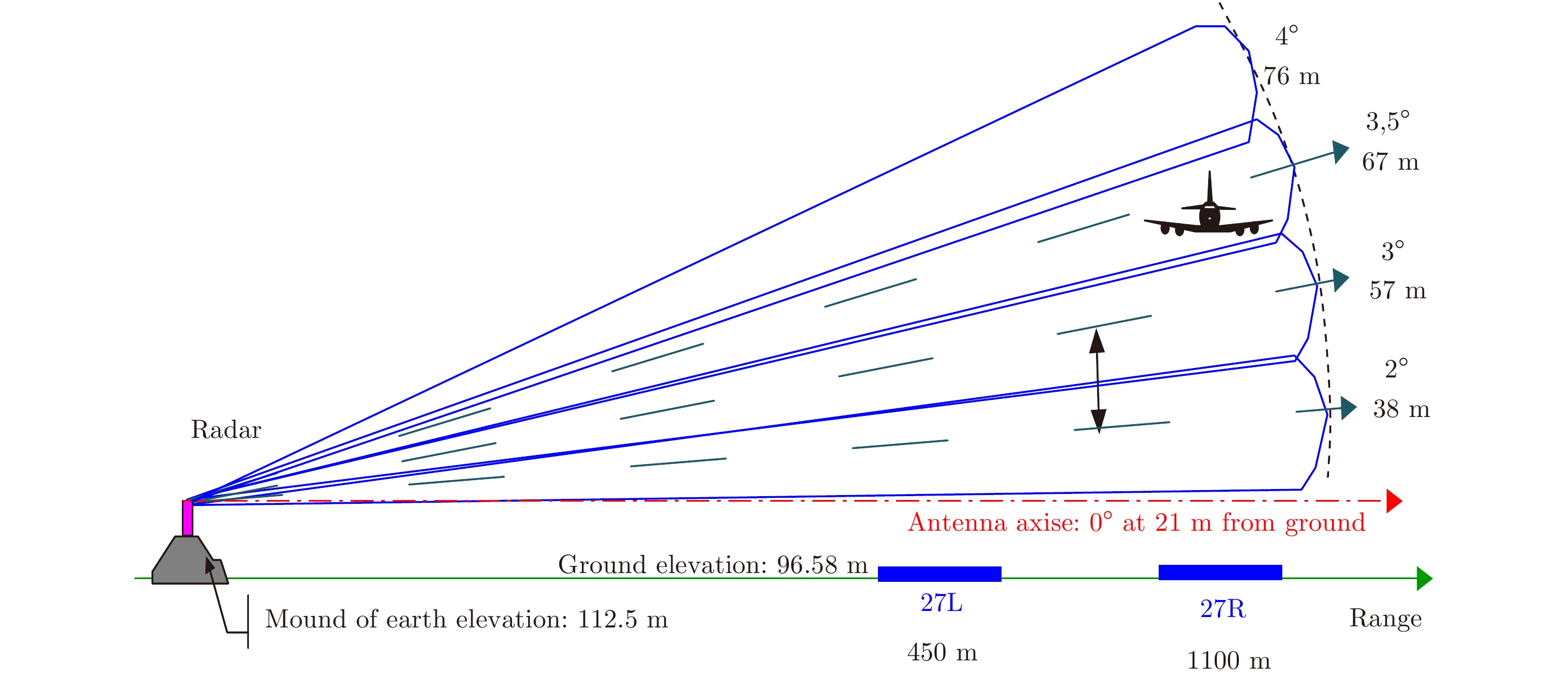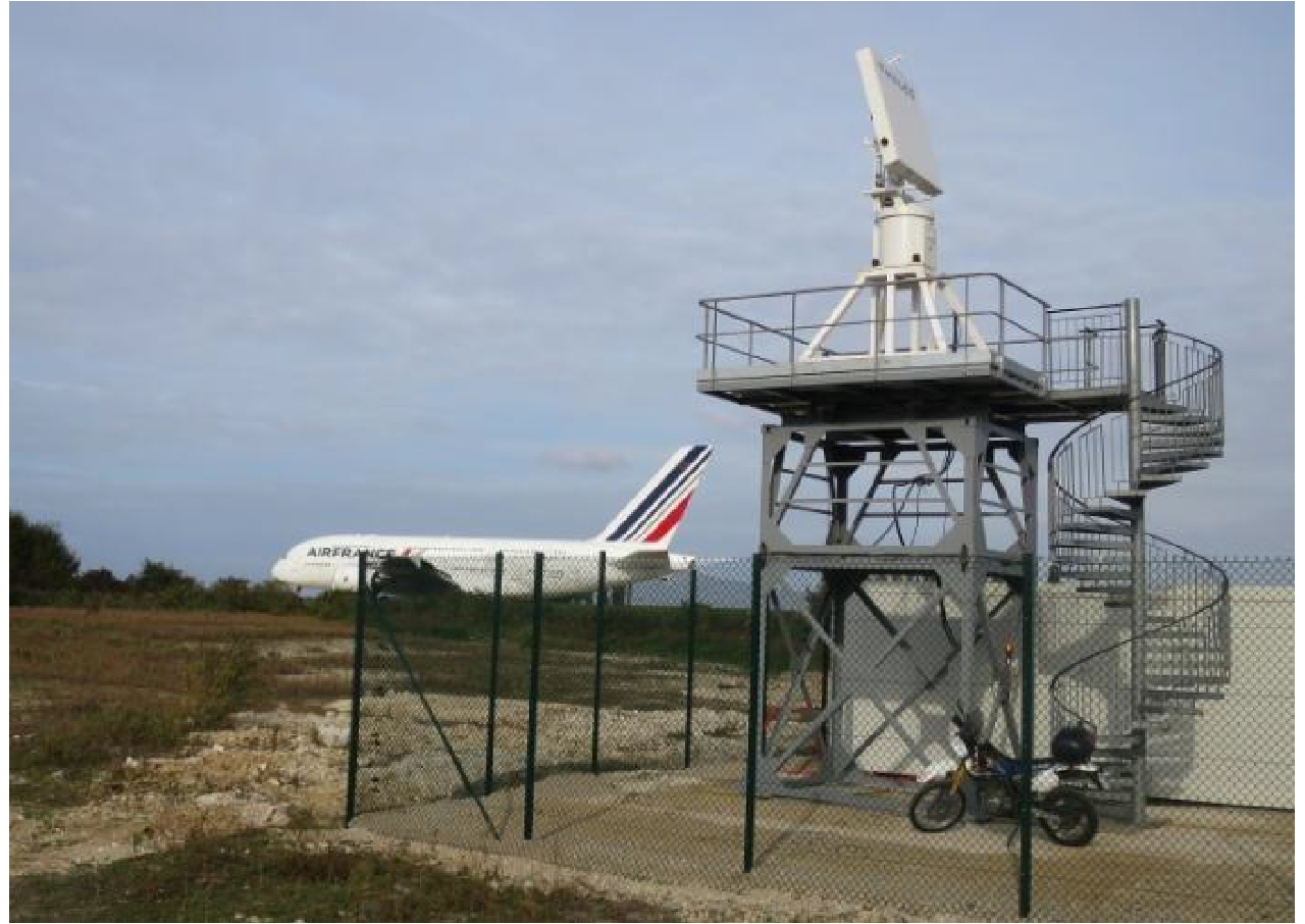 2 Field Instrumentation and Measuring Setup 2.1 THALES X-band radarThe THALES radar was deployed close to the 27R landing glide (see Fig. 1 and Fig. 2): its distance to the 27R glide is approximately 1100 meters and its distance to the 27L glide is approximately 700 m. Its distance, measured parallel to the glide, is 1420 m from the landing threshold 27R.