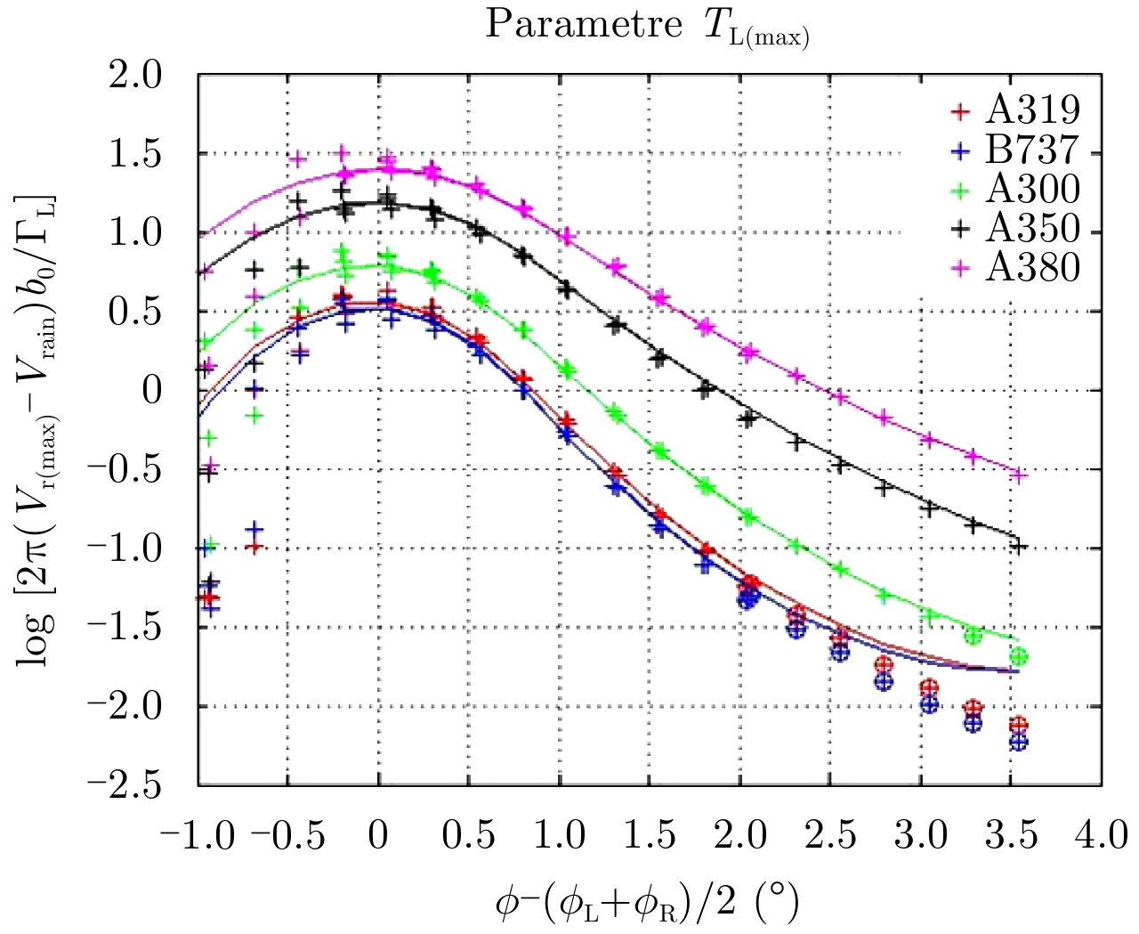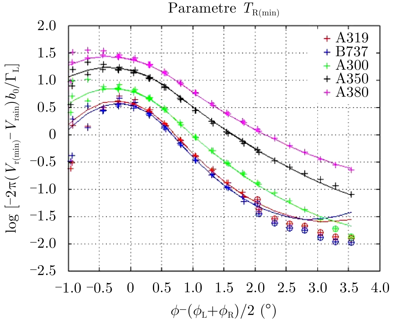 $\left. \begin{array}{l} \frac{{{V_{\rm{r}}} - {V_{{\rm{rain}}}}}}{{{\Gamma _{\rm{L}}}}} \cdot 2 \cdot {{π}} \cdot {b_0} = {T_{{\rm{L}}(\max )}} \\ \quad \approx {A_{\rm L}}\left( {0,\frac{{\phi - {\phi _{\rm{L}}}}}{{{\phi _{{\rm{beam}}}}}}} \right)\\ \frac{{{V_{\rm{r}}} - {V_{{\rm{rain}}}}}}{{{\Gamma _{\rm{R}}}}} \cdot 2 \cdot {{π}} \cdot {b_0} = {T_{{\rm{R}}(\min )}} \\ \quad \approx - {A_{\rm R}}\left( {0,\frac{{\phi - {\phi _{\rm{L}}}}}{{{\phi _{{\rm{beam}}}}}}} \right)\end{array} \right\}$ | (5) |