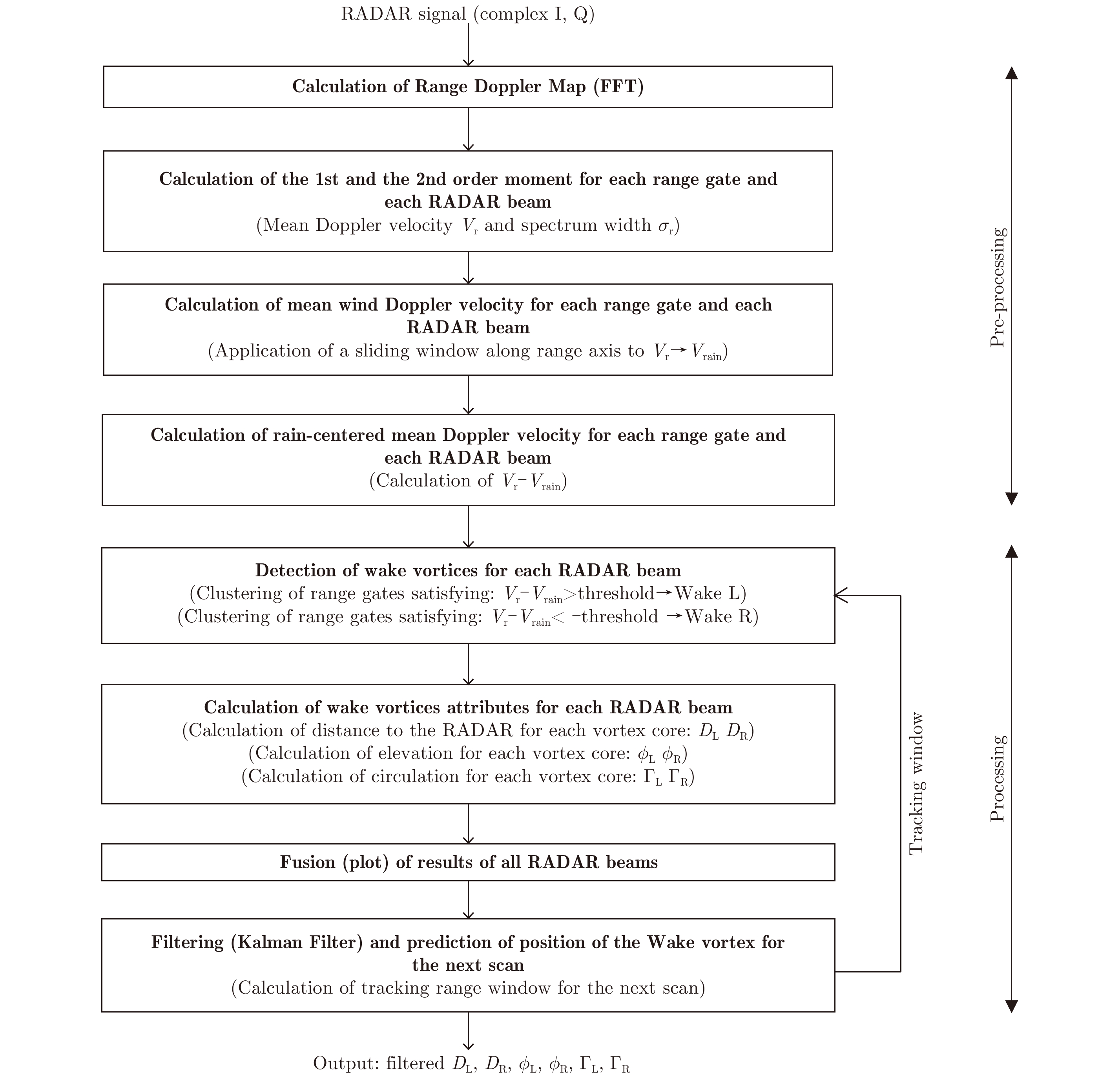 3 Retrieval Algorithm 3.1 MethodologyThe document[3] provides recommendations on the type of sensors to be included in a system intended to detect vortices in all weather conditions. These recommendations are to deploy an X band RADAR and a 1.5 μm LIDAR both located perpendicularly to the runways, a few hundred meters upstream from the touch down area. Results in Ref. [3] show that RADAR and LIDAR are complementary depending on weather conditions: the X-band RADAR performances are optimal under rainy conditions while LIDAR performances are optimal in dry air.