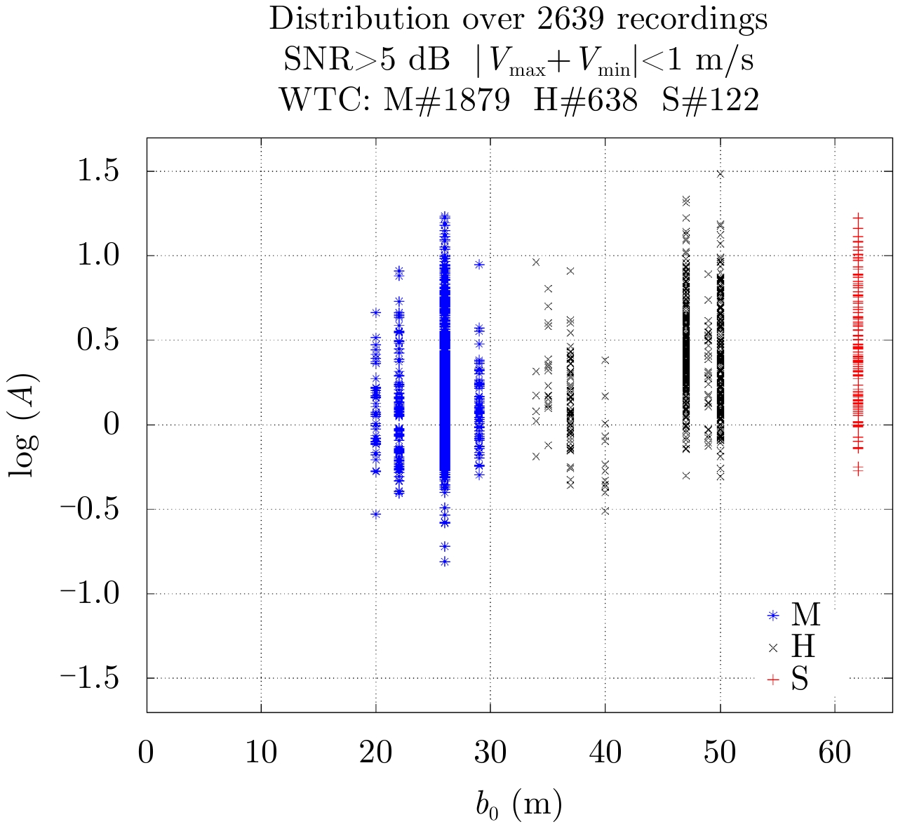 The simulation results presented in Subsection 3.2 predict that the coefficient A depends on b0, the distance between the two cores L and R. This is not confirmed by the Fig. 23 showing the coefficient log(A) (A is expressed in log scale) as a function of the theoretical distance b0 for all aircrafts landing at threshold 27R: the observed log(A) fluctuates randomly around 0 but is independent from the observed b0 varying from 20 m to 62 m.