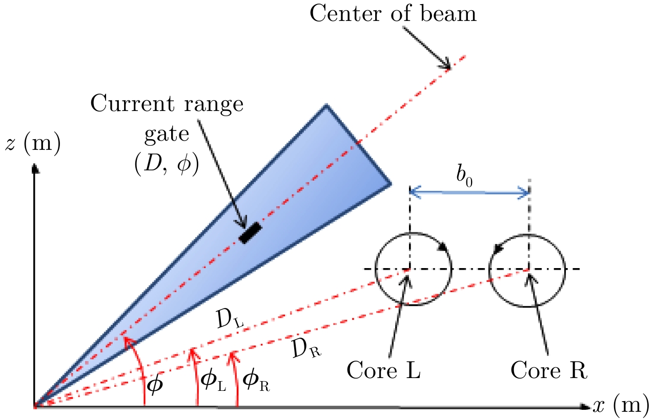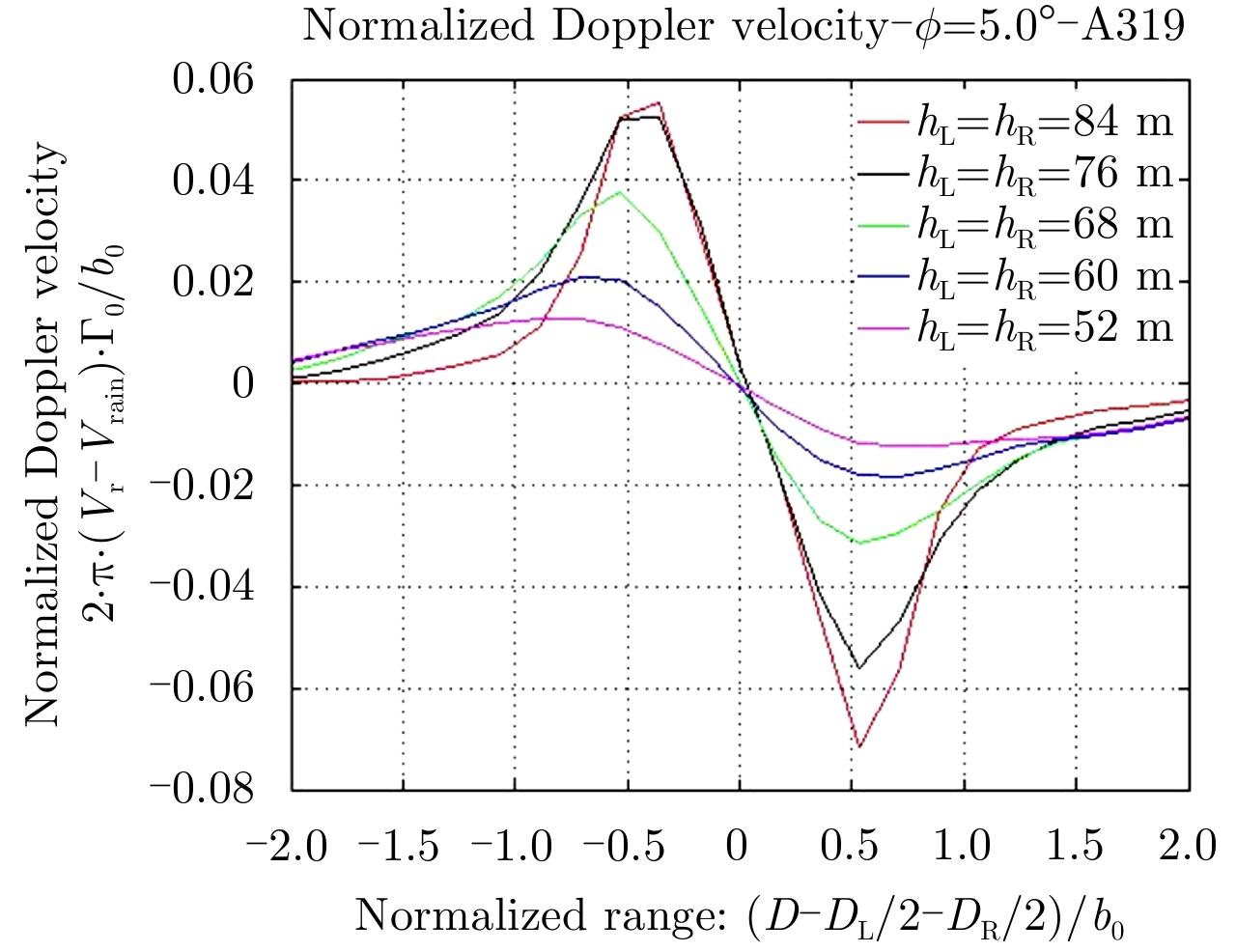 $\begin{align}{V_{\rm{r}}} = & {V_{{\rm{rain}}}} + \frac{{{\Gamma _L}}}{{2 \cdot {{π}} \cdot {b_0}}} \cdot {A_{\rm{L}}}\left( {\frac{{D - {D_{\rm{L}}}}}{{{b_0}}},\frac{{\phi - {\phi _{\rm{L}}}}}{{{\phi _{{\rm{beam}}}}}}} \right)\\&- \frac{{{\Gamma _{\rm{R}}}}}{{2 \cdot {{π}} \cdot {b_0}}} \cdot {A_{\rm{R}}}\left( {\frac{{D - {D_{\rm{R}}}}}{{{b_0}}},\frac{{\phi - {\phi _{\rm{R}}}}}{{{\phi _{{\rm{beam}}}}}}} \right)\end{align}$ | (2) |