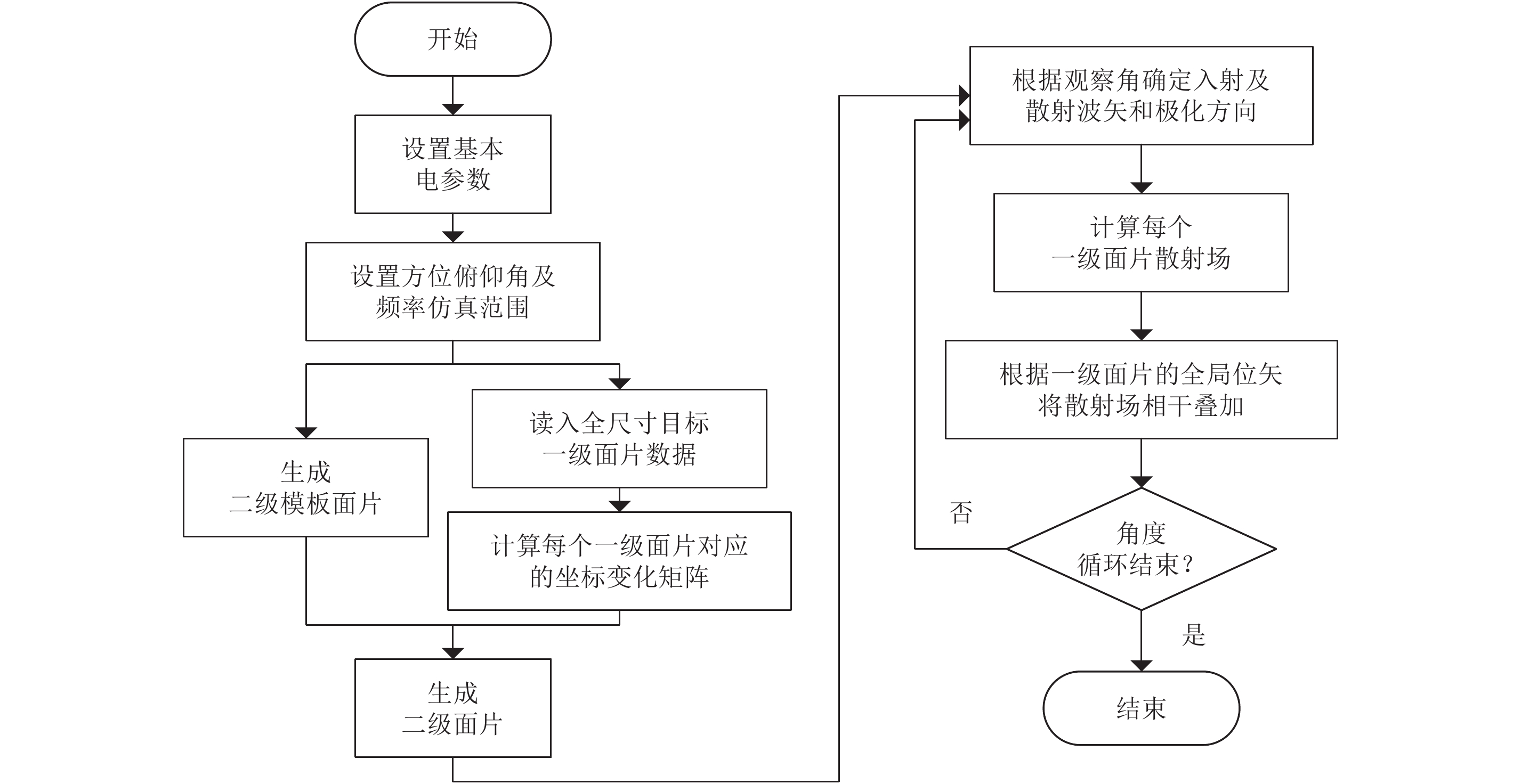 需要说明的是,以上建模过程中为了简化问题,忽略了面片间的互遮挡问题。对于形状较复杂的目标,互遮挡判断往往是不可或缺的一步。为此,本文在后续内容中假定目标是不存在部件互遮挡的简单凸体。下面给出全尺寸目标的散射建模与回波仿真计算流程,如图4所示。