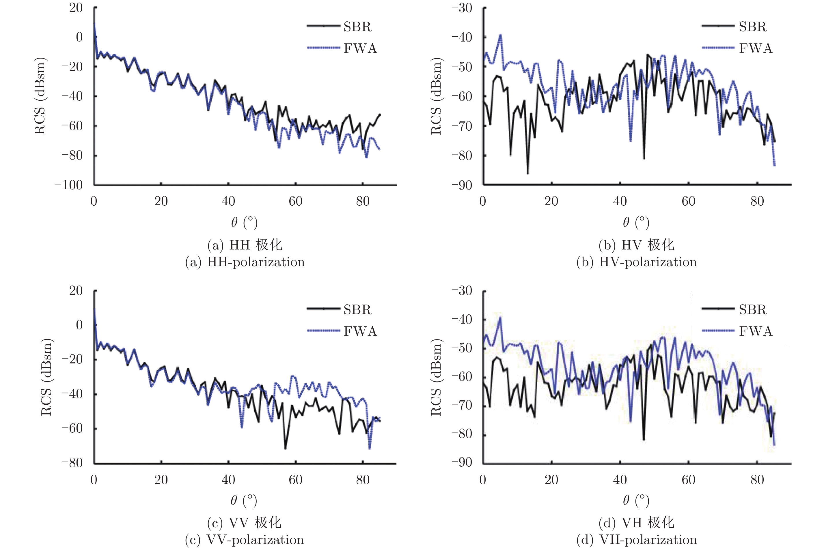 图5展示了4种极化关系下的粗糙矩形板RCS计算结果。由图5(a)与图5(c)可见,HH极化与VV极化在入射角角度小于50°的区间,两者计算的RCS曲线基本重合,接近掠入射时,FWA与SBR计算结果出现一定偏差。由图5(b)和图5(d)可见,FWA计算结果与SBR计算结果的趋势基本相符,在小入射角时偏差稍大。对比同极化和交叉极化散射分量可以发现,同极化分量的能量明显大于交叉极化分量,因此对交叉极化分量计算的偏差对总体RCS计算结果的影响较小。我们认为造成FWA与SBR计算结果在若干角度存在一定偏差的原因有以下几点:①当入射角接近掠入射时,二级面片间的互遮挡现象将十分普遍,而当前实现的FWA算法中并未考虑面片间的互遮挡问题,从而造成了一定的计算误差;②对于交叉极化散射分量,面片间的相互耦合是去极化现象形成的重要原因,而由式(1)可以看出,FWA算法中并未包含射线追踪操作,因此对交叉极化分量的计算存在一定误差。尽管如此,从雷达回波仿真的角度本文所提方法的计算结果仍是令人满意的。