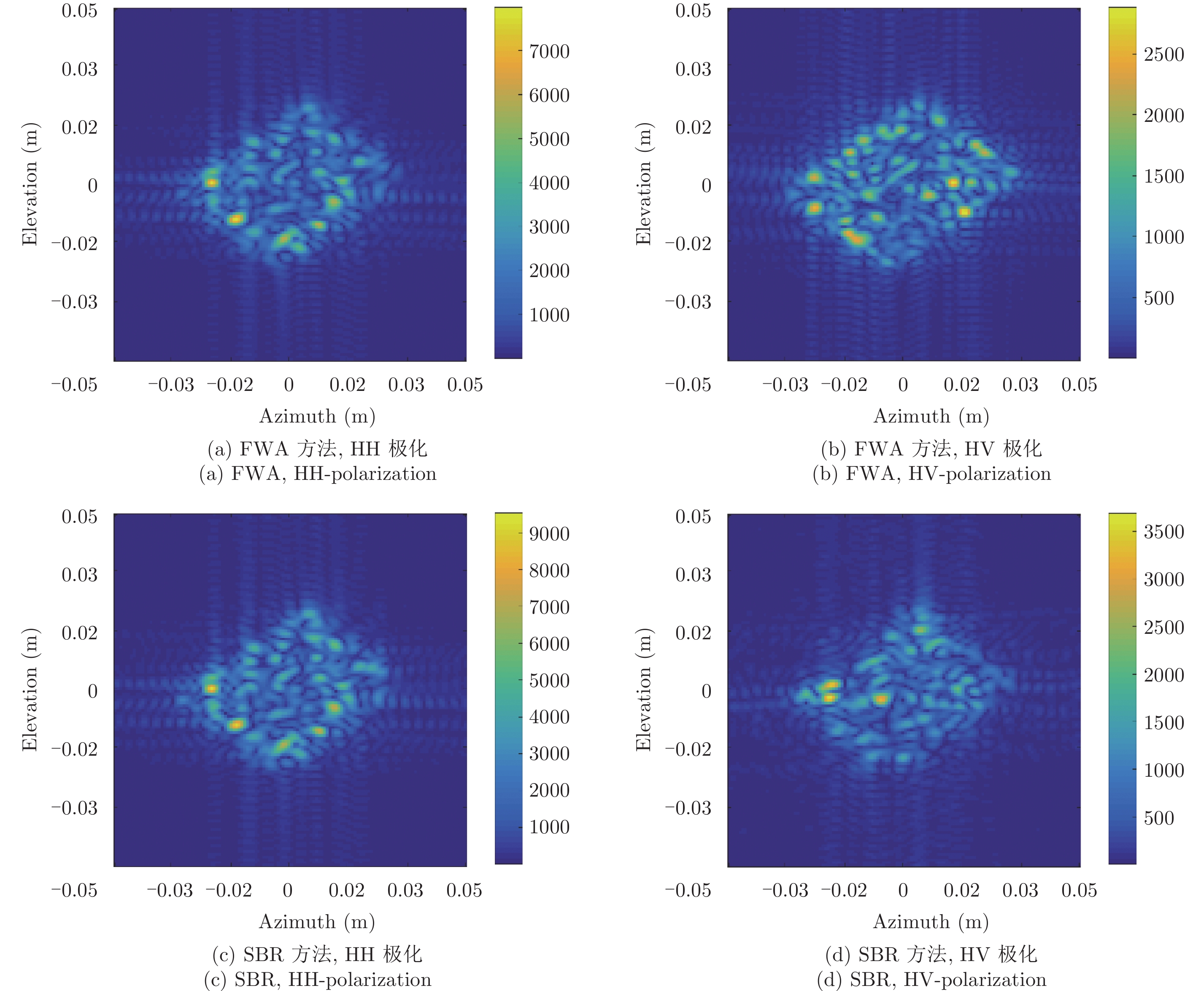 由图6可以看出,依据FWA和SBR计算数据回波的成像结果基本一致,对比图6(a)与图6(c)、图6(b)与图6(d)可发现,两种方法的同极化成像结果在强点位置、粗糙纹理上都十分相似。交叉极化的成像结果中的纹理细节虽不一样,但仍具有相似的粗糙特征。VV极化和VH极化的成像结果分别与HH极化和HV极化的成像结果是相似的,在此不再展示。