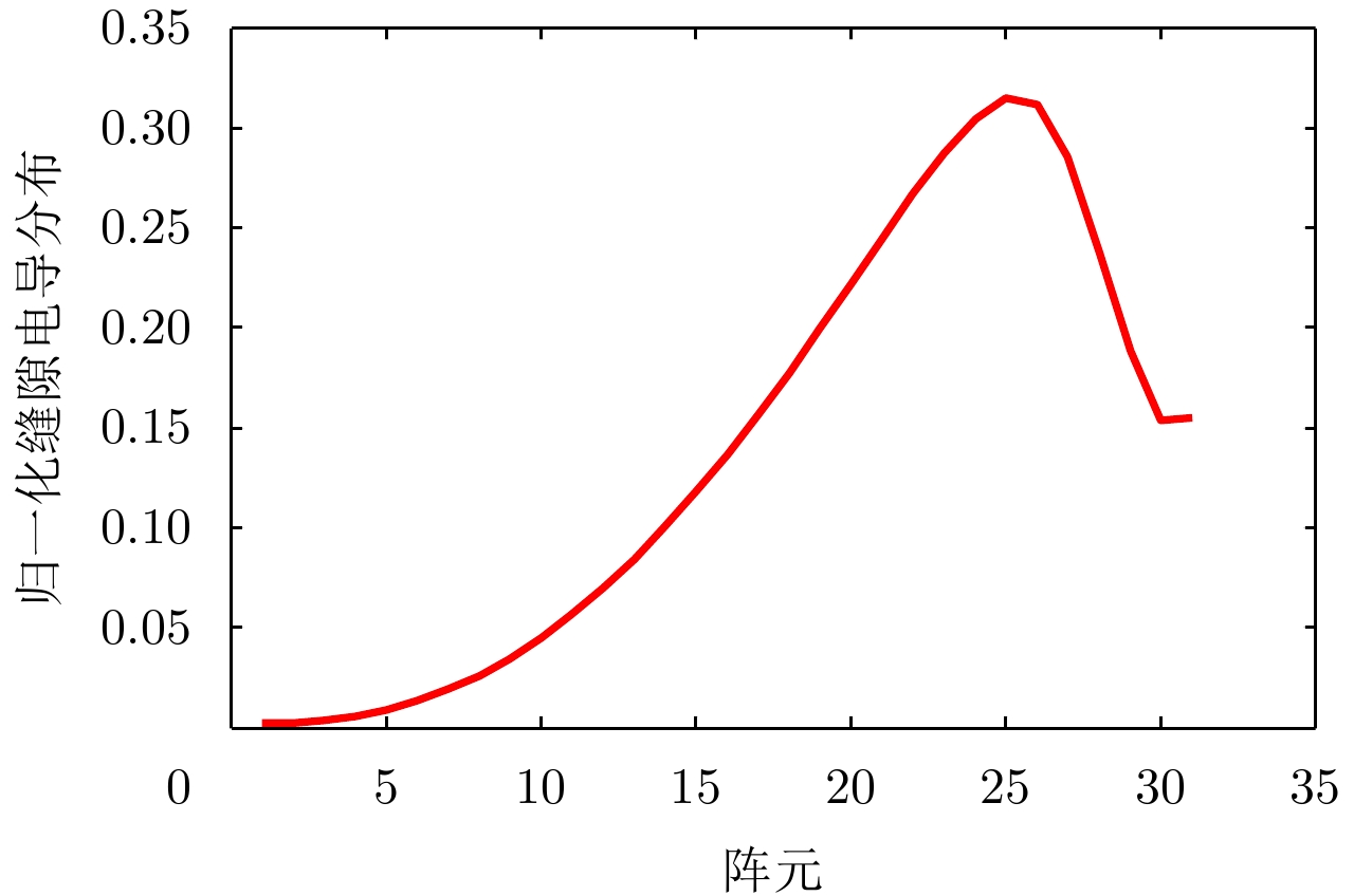 通常契比雪夫分布的阵列辐射特性比较好,在相同阵列长度下对给定的副瓣电平,其主瓣是最窄的,副瓣电平是最低的。但是它的等副瓣特性会造成能量的损耗较多,而且两端单元的激励电流的幅度往往比其相邻单元电流的幅度变化大得多,这对缝隙的馈电以及端口反射特性造成较大的损失,而且副瓣电平对激励电平的误差比较敏感。本文采用泰勒分布降低副瓣电平。根据太赫兹成像和目标探测要求,选定副瓣电平SLL=–30 dB,辐射缝隙个数为31时,根据功率传输法[26],对应于泰勒分布的缝隙电导为