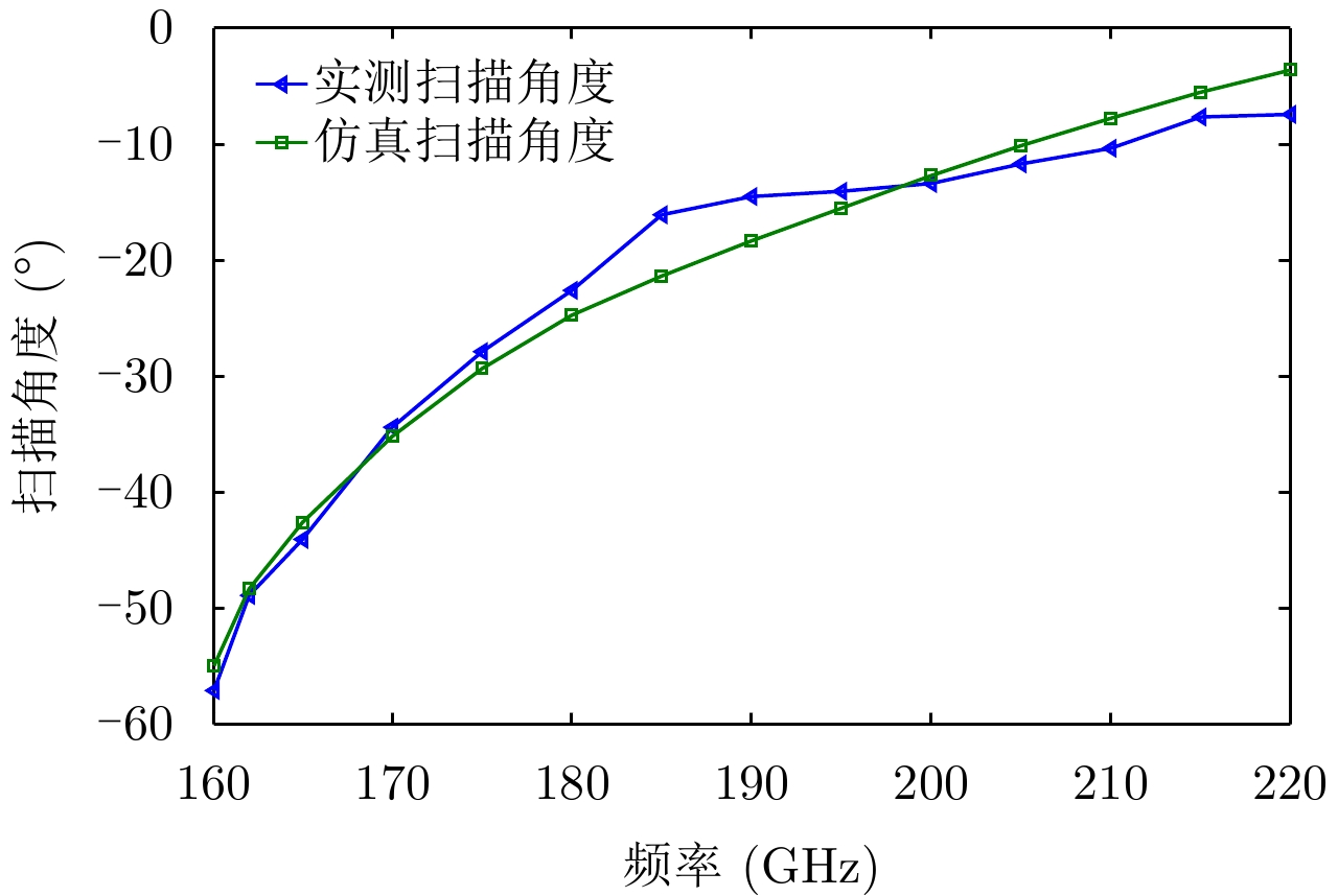 如图7所示,扫描角度仿真与测试比较吻合,实测的扫描角度为–3.8°~53.8°,仿真的扫描角度为–7.37°~–56.98°,在60 GHz带宽内扫描了50°。如图8所示,若以–20 dB副瓣带宽计,在165~215 GHz频带范围内,扫描角度为–4.8°~–45.2°,在50 GHz带宽内扫描了40°,说明该太赫兹波导缝隙天线具有宽角度扫描特性;实测扫描角度比仿真的扫描角度整体向边射方向偏移,误差来自天线加工误差以及测量中天线摆放角度的误差。