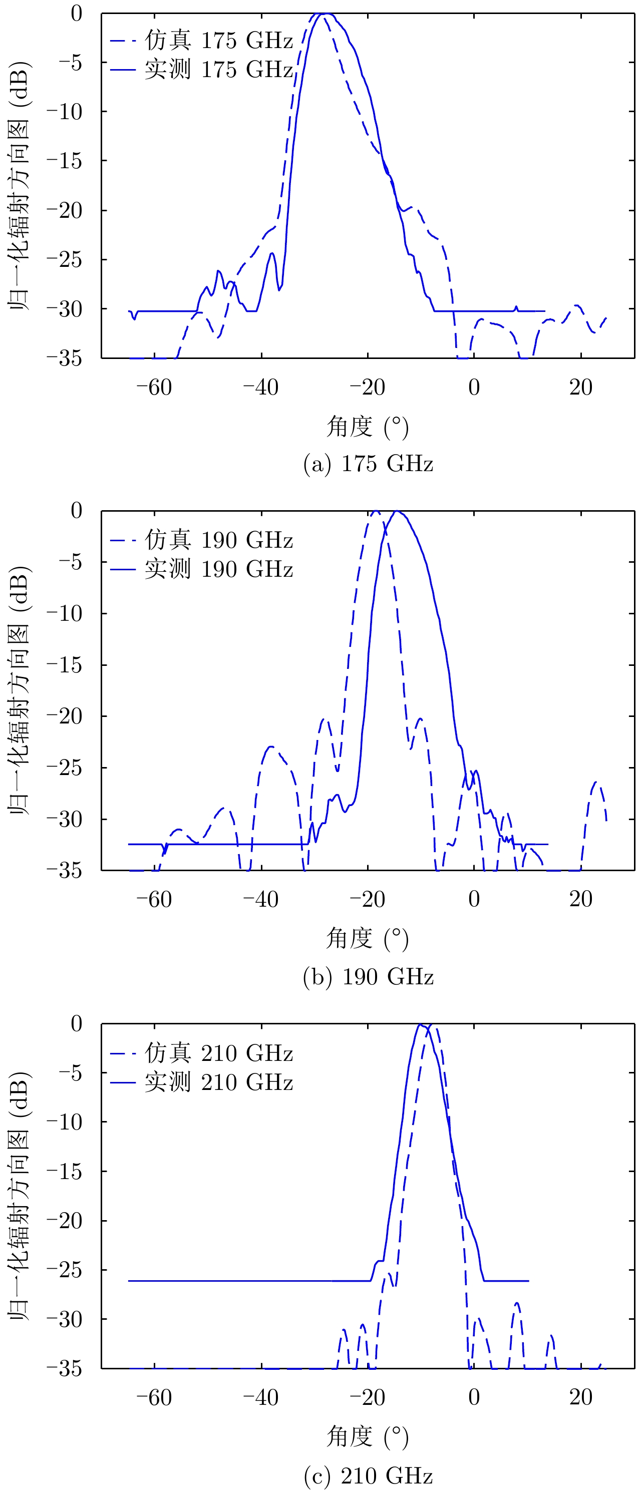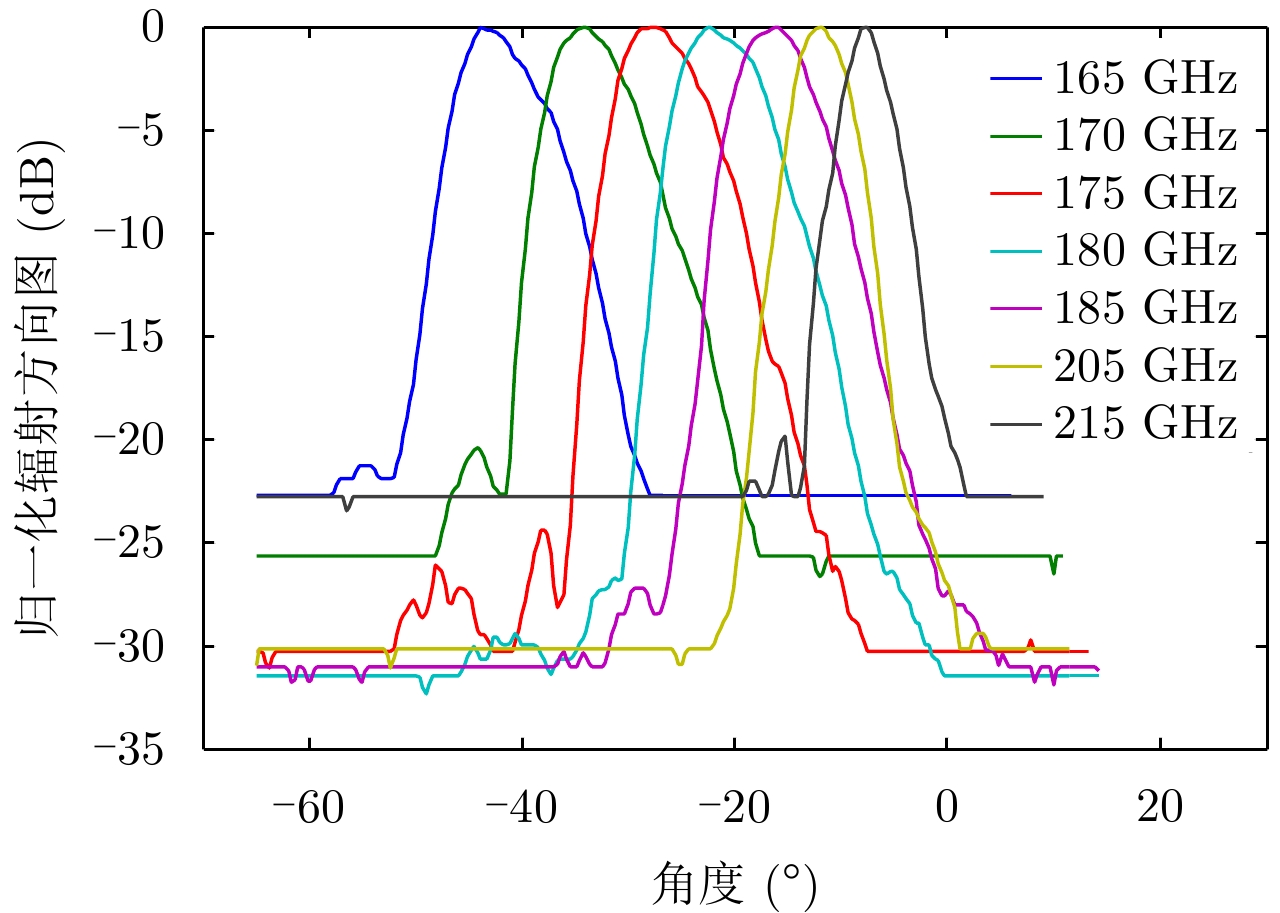 如图8所示实验测得xy平面内扫描波束的归一化方向图,主瓣方向图比较光滑,在扫描平面内波束比较窄,3 dB波束宽度为4°~7°,且波束宽度随着频率的升高而减小;除去两端的频率点外,在165~215 GHz频段内副瓣电平平均小于–20 dB。