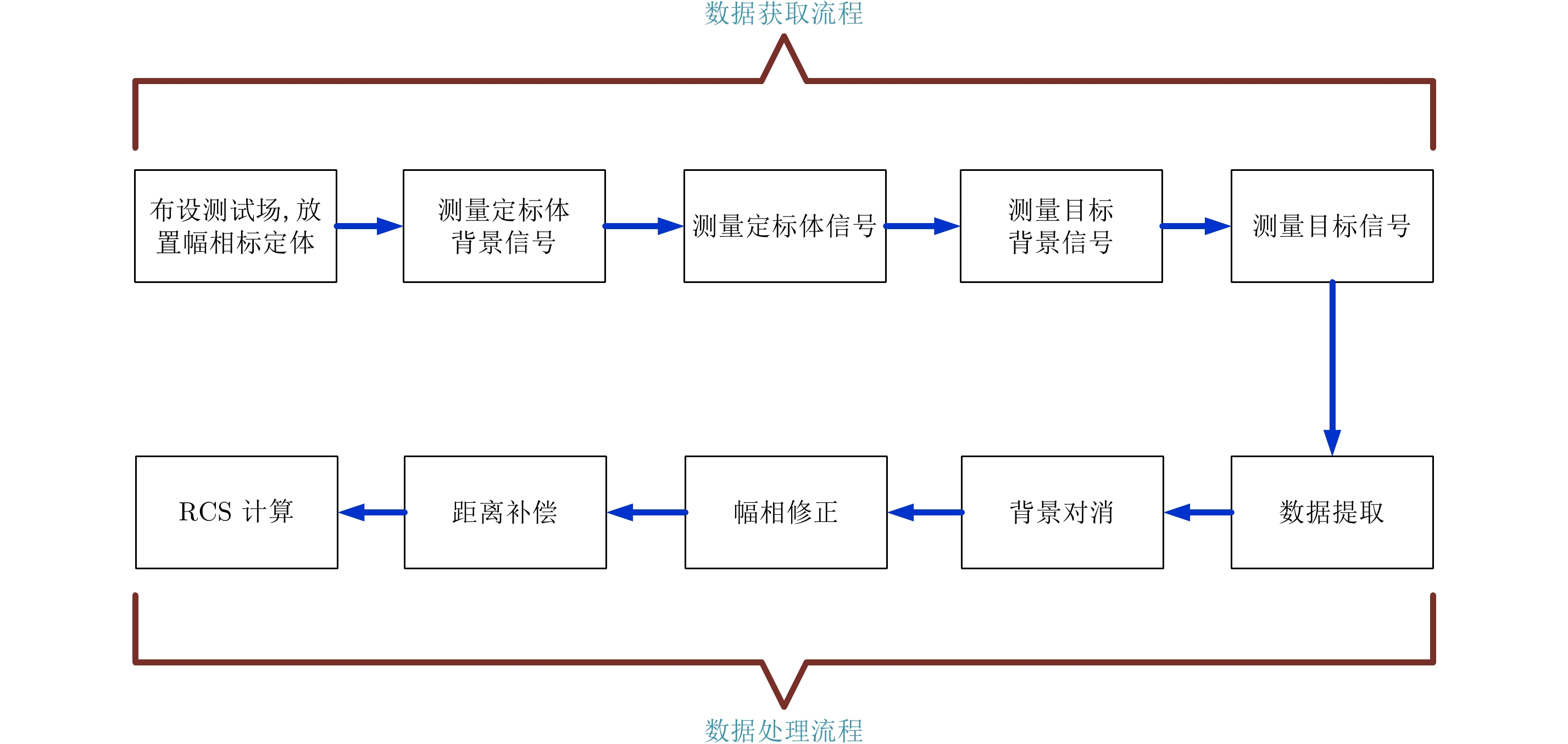 实际测量流程分为数据获取和数据处理两部分,在数据获取流程中,共获取包括幅相修正信号数据在内的,目标背景数据、目标数据、定标背景数据、定标数据共4组数据。将这4组数据带入数据处理流程,通过数据提取获得测试区原始数据,再通过背景对消、距离补偿、幅相修正等测量技术降低散射测量误差,最终计算获得目标RCS。