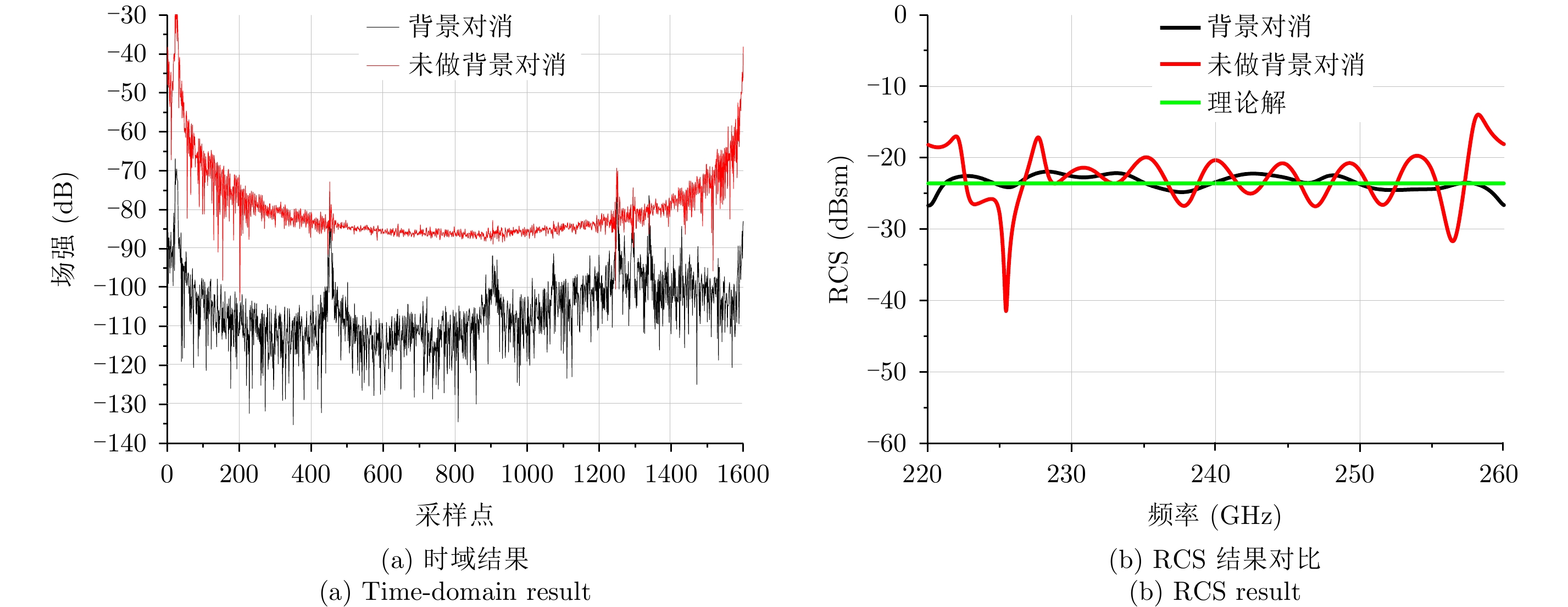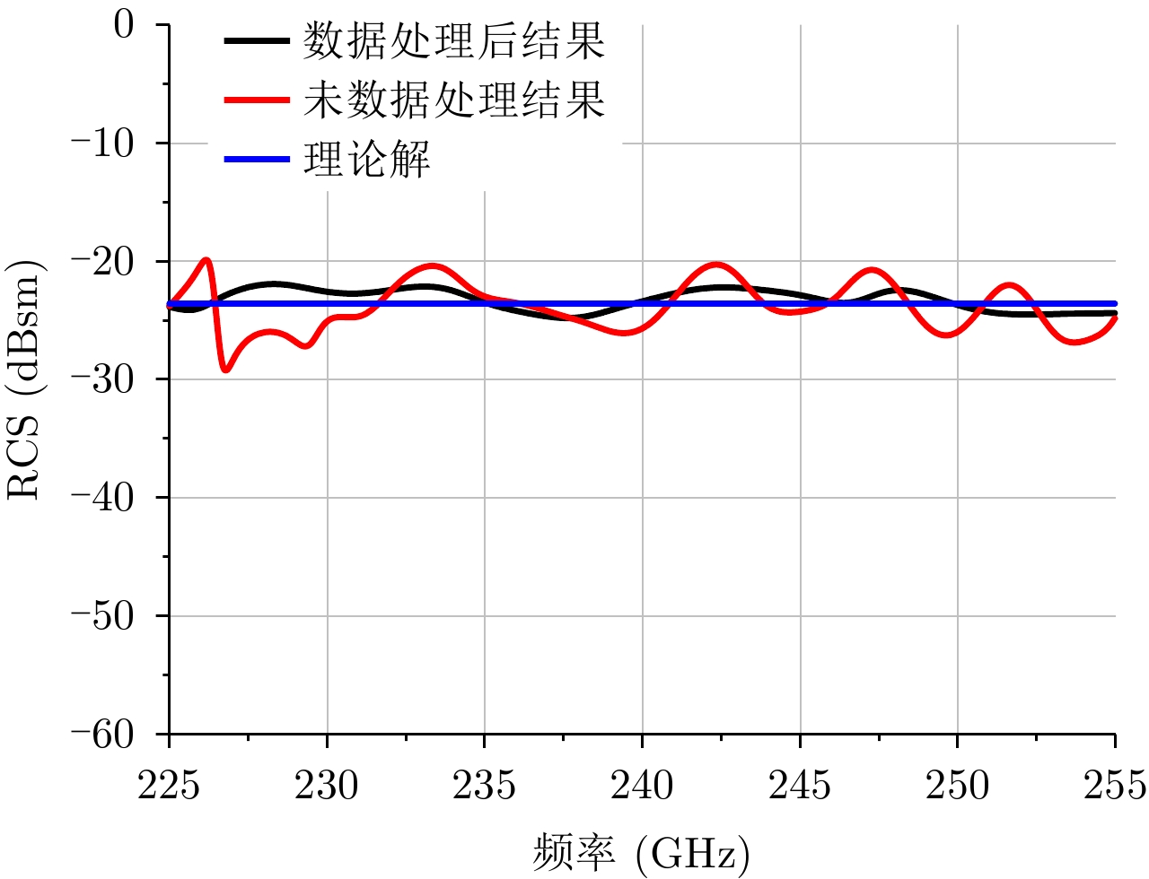 图4中测量结果是对背景对消技术在太赫兹频段应用的验证结果。其中待测目标为75 mm(直径)标准球。从图4(a)中可以得到,在未加入频域窗的情况下,背景对消技术在目标区可以提高10~15 dB的信噪比。从图4(b)中的结果可得,测量结果的最大偏差量由对消前的3.67 dB降至对消后的1.45 dB,均方根误差由2.00 dB降至0.92 dB。