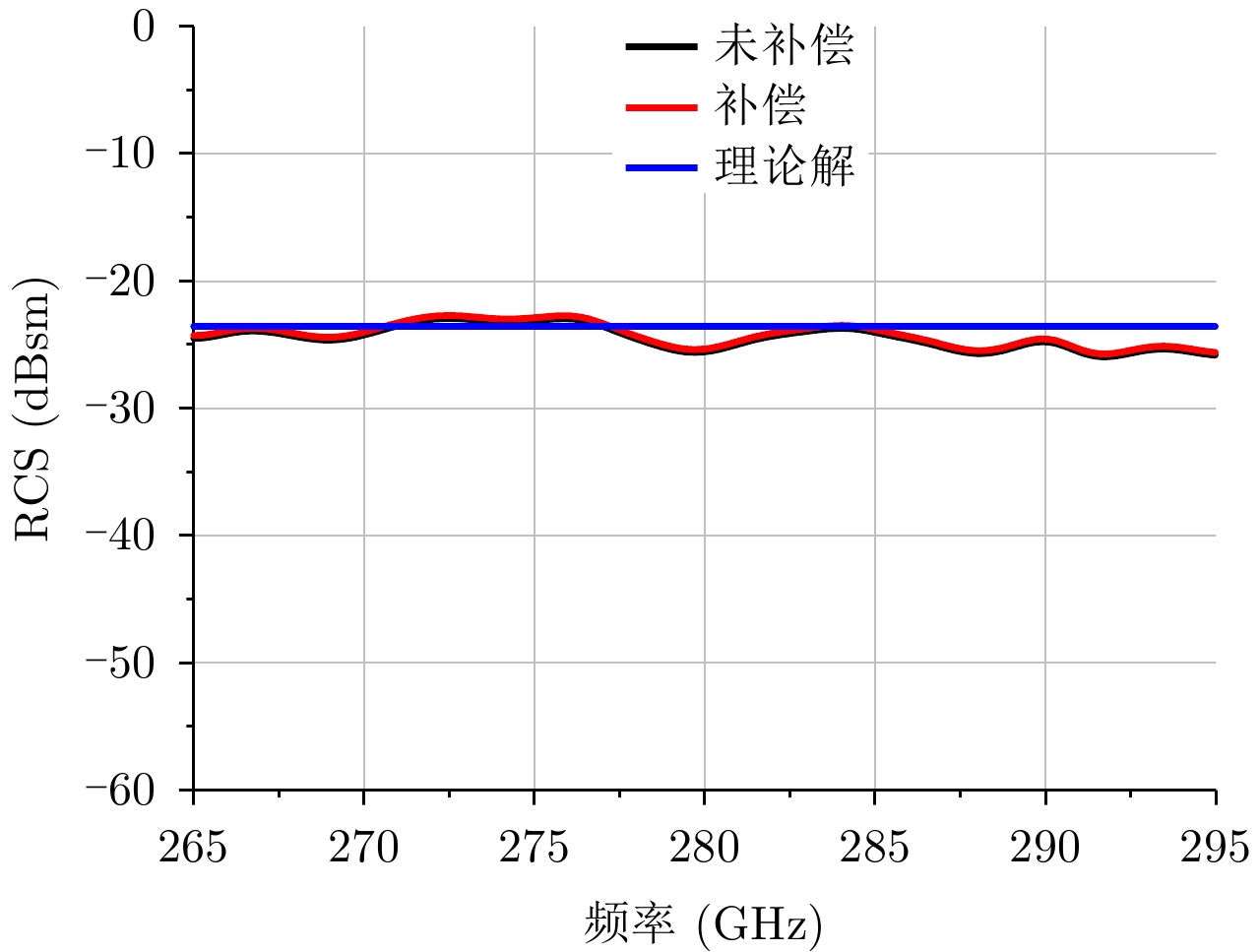 本文中,我们利用矢网搭建了微波倍频源太赫兹散射测量系统,对75 mm(直径)标准球(RCS=–23.6 dBsm),测量试验中对背景对消、距离补偿、幅相修正等误差抑制技术进行了验证。通过多种误差抑制技术的应用,明显地提高了目标测量精度,最终测量结果均方根误差控制在1 dB左右。在残留误差中,目标与泡沫支撑柱之间的耦合、目标摆放、环境多径影响、环境震动是主要误差源,其误差抑制方法,耦合抑制方法,需要今后继续进行有针对性的设备设计及相应研究。