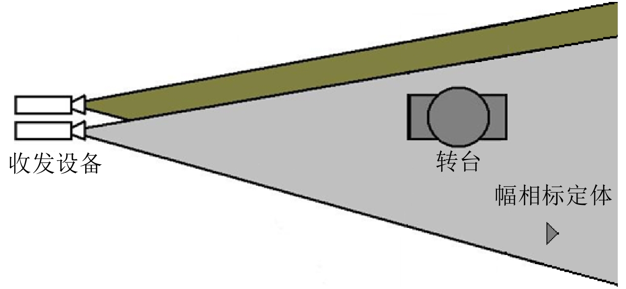 幅相标定体需要具有较强的后向散射,摆设位置与被测目标互不遮挡。幅相标定体与被测目标位置足够远,以降低两者之间互耦对测试精度造成的影响。一般可将幅相定标体放置于测量区域以外,将其置于测量天线副瓣范围内,这样可保证与测量目标距离足够远,而幅相标定体后向散射足够高可以保证信噪比。摆放示意图如图6所示。