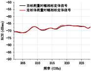 在不放置物体及幅相定标体时测量背景信号Bc, Bt,放置目标和幅相定标体测量目标信号,保持幅相定标体不动,将目标换为定标体,测量定标体信号。通过测量信号1维距离像,选取出幅相标定体信号,作为测量信号的幅相变化的监测信号。将目标区信号向标定体信号进行归一,以达到降低测量信号抖动引起的测量误差。设:D为目标幅相修正信号;