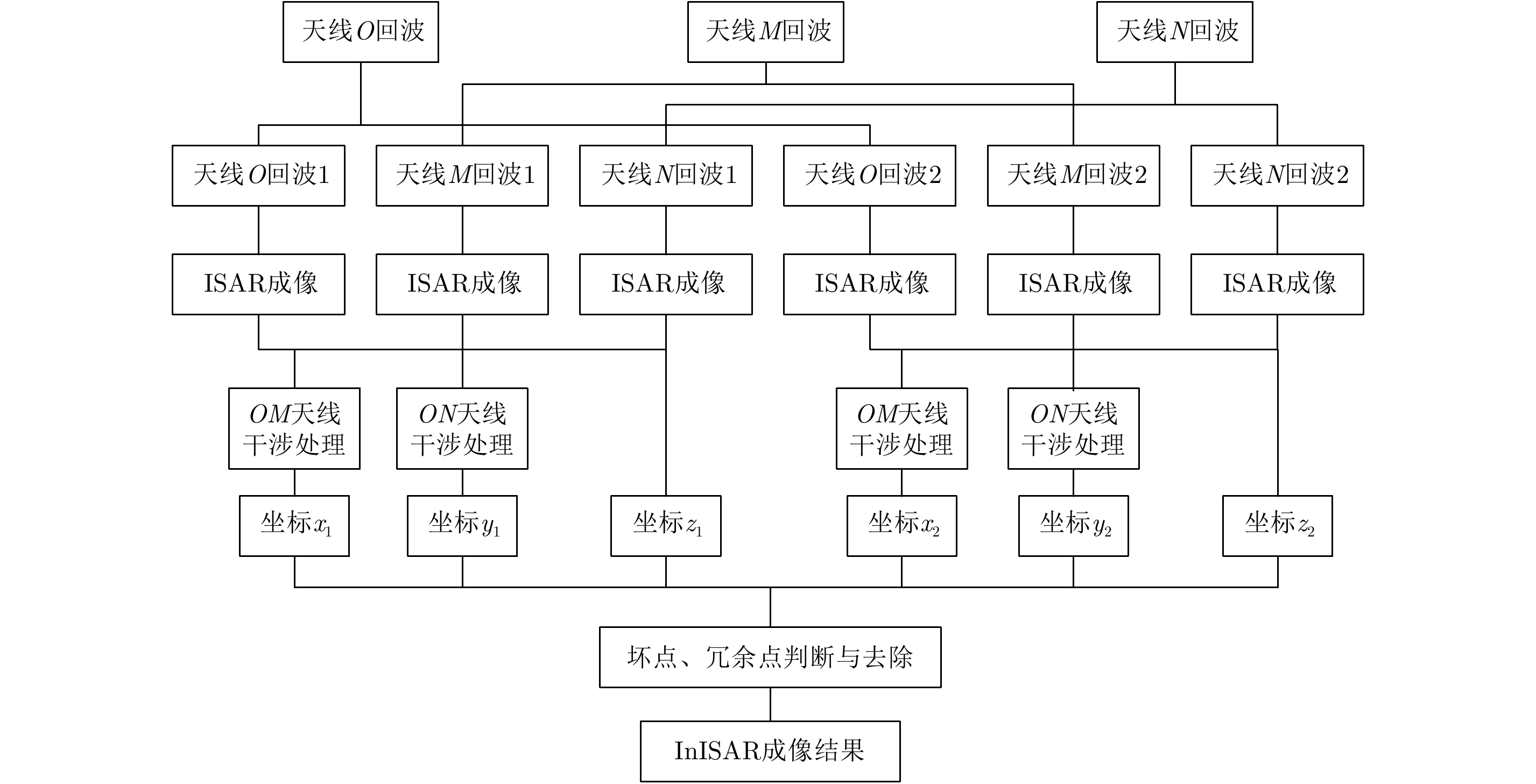 高分辨的目标3维像相比于传统1维像和2维像,具有更全面的目标属性和特征信息,有利于提高目标分类和识别精度,是当前雷达技术研究的重要内容之一[1]。逆合成孔径雷达(Interferometry Inverse Synthetic Aperture Radar, InISAR)系统在雷达坐标系的水平和竖直方向布置多个天线,利用散射点到达水平天线对间的干涉相位和竖直天线对间的干涉相位求解对应波程差,进而解算出目标散射点相对于参考点的水平和竖直位置,该技术能够在较短的观测时间内获得目标的3维(three-Dimensional, 3D)成像结果,在目标识别和分类中有着广泛应用[2–5]。