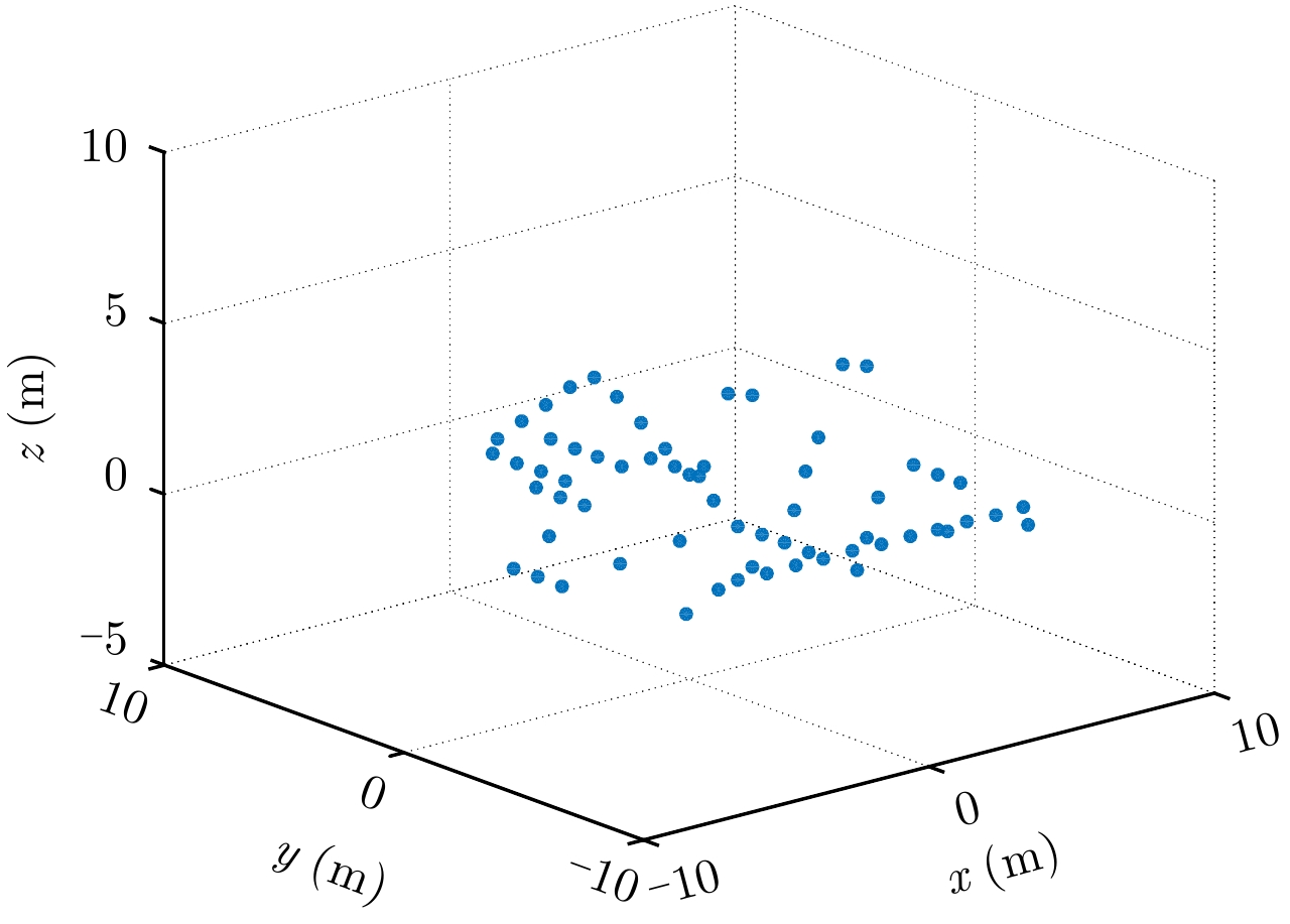 3 仿真分析按照图1所示的L型天线干涉结构,对本文所提方法进行成像仿真验证。仿真目标采用由35个散射点组成的3维飞机模型,如图3所示,成像仿真参数设置如表1所示。