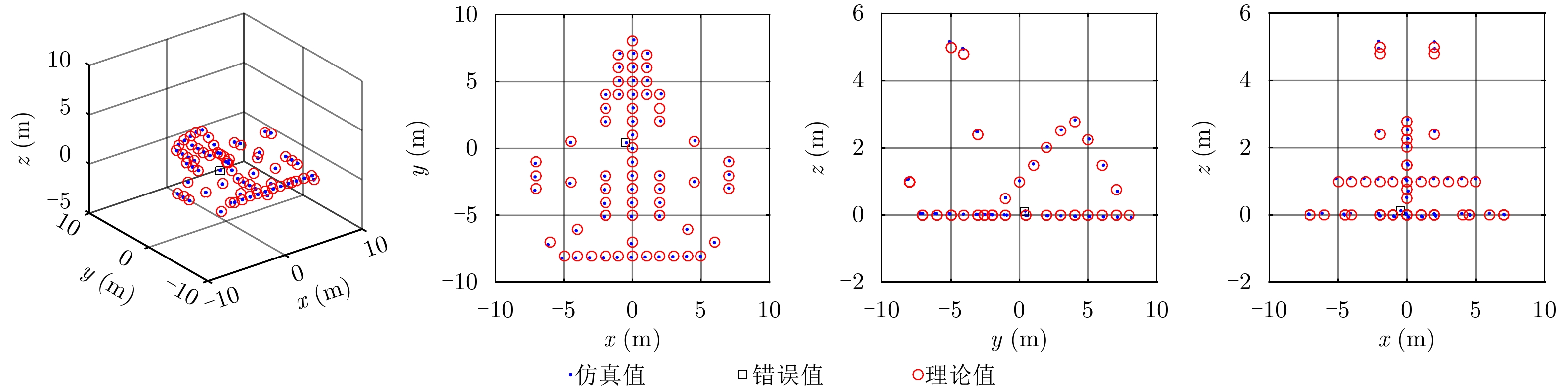 根据2.2节中的基于双频联合处理的太赫兹InISAR成像方法,可获得如图4所示的雷达回波不添加噪声时飞机模型的3维重构结果。其中,联合处理判断门限根据目标散射点模型的尺寸和间距设置,
